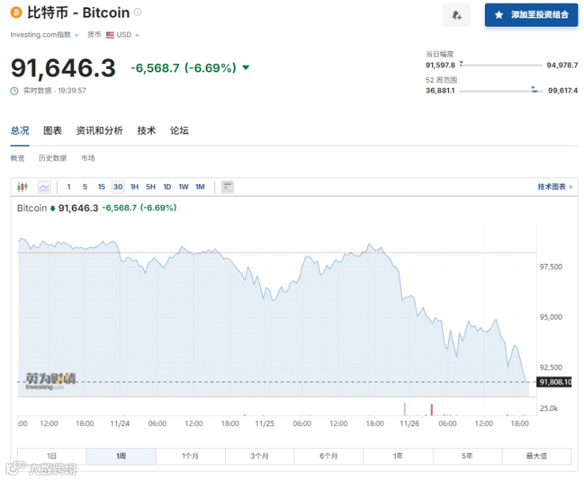 本周以来,加密货币价格大幅调整,比特币从9.89万美元/枚左右,最低跌至9.15万美元/枚。截至周二晚间19时40分左右,24小时内,比特币下跌6.69%报9.16万美元/枚;以太坊跌近5%报3302美元/枚;其中品种方面,Solana跌超10%,XRP、狗狗币跌超13%,艾达币跌近16%。整个加密货币市场的市值,蒸发超1800亿美元。