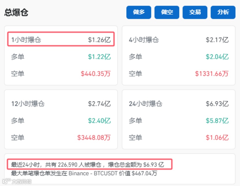 coinglass数据显示,24小时内,加密货币市场爆仓人数接近22.66万人,爆仓金额为6.93亿美元,其中多单爆仓5.87亿美元,空单爆仓1.06亿美元。