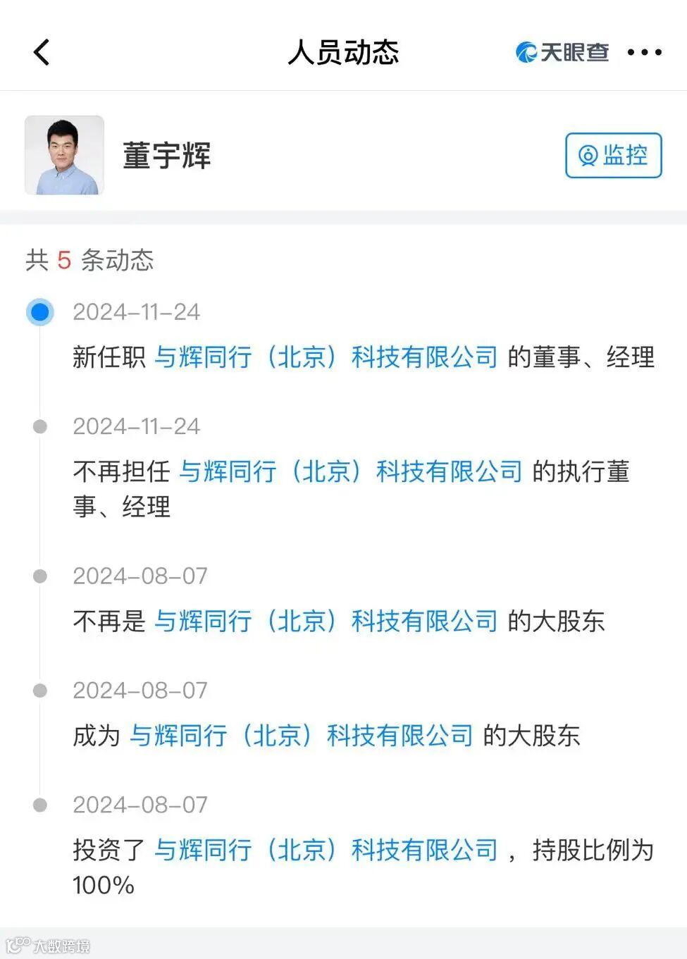 据天眼查APP显示,11月24日,与辉同行(北京)科技有限公司发生工商变更,董宇辉由执行董事、经理变更为董事、经理。