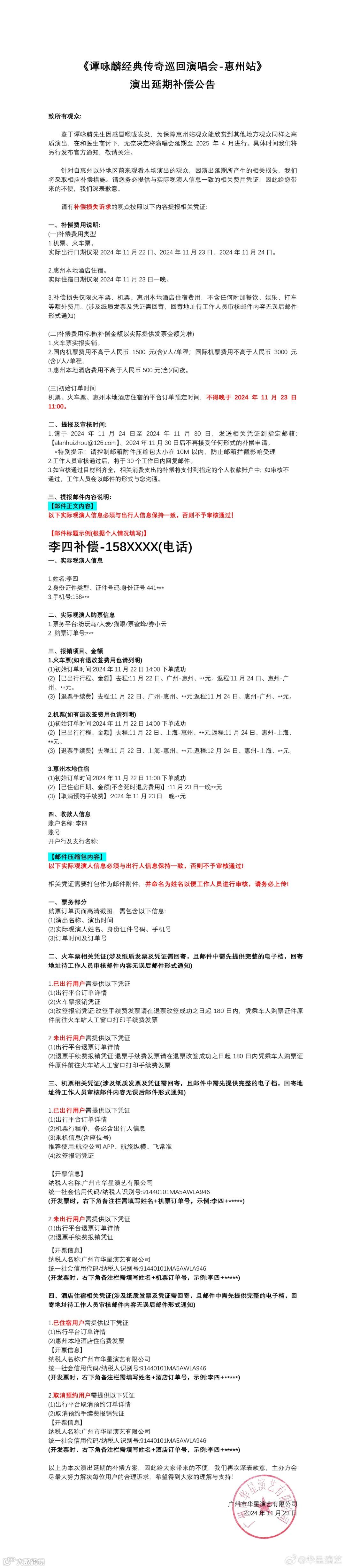 针对自惠州以外地区前来观看本场演出的观众,因演出延期所产生的相关损失,将采取相应补偿措施。须提供与实际观演人信息一致的相关费用凭证。其中,火车票实报实销,国内机票不高于1500元/人/单程,国际机票不高于3000元/人/单程,惠州本地酒店不高于500元/间夜。