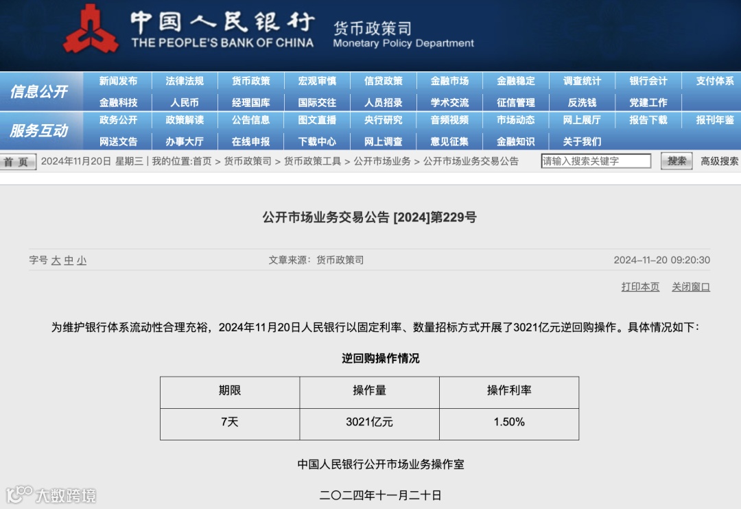 此外,央行11月20日进行3021亿元7天期逆回购操作。中标利率为1.50%,与此前持平。