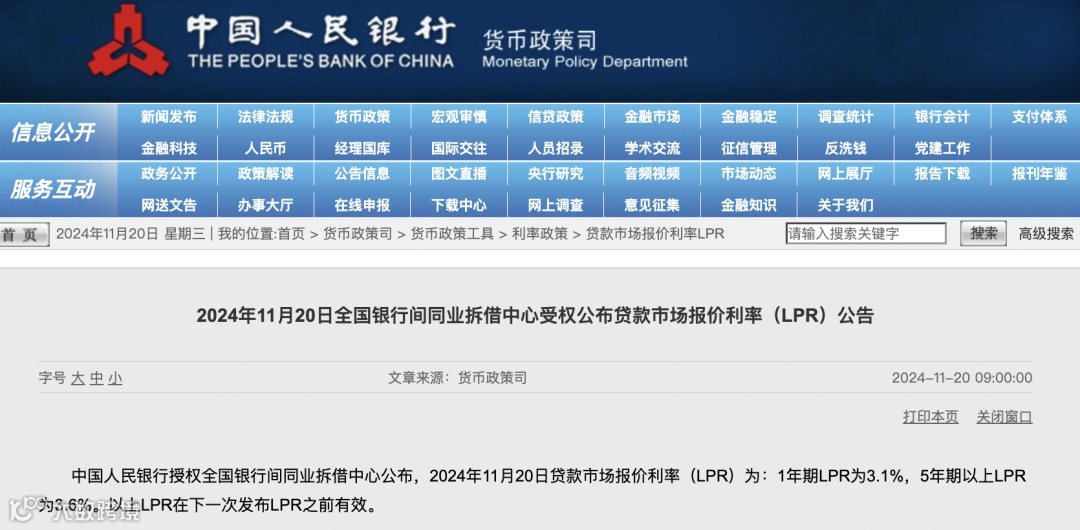 11月20日,央行授权全国银行间同业拆借中心公布,2024年11月20日贷款市场报价利率(LPR)为:1年期LPR为3.1%,5年期以上LPR为3.6%。