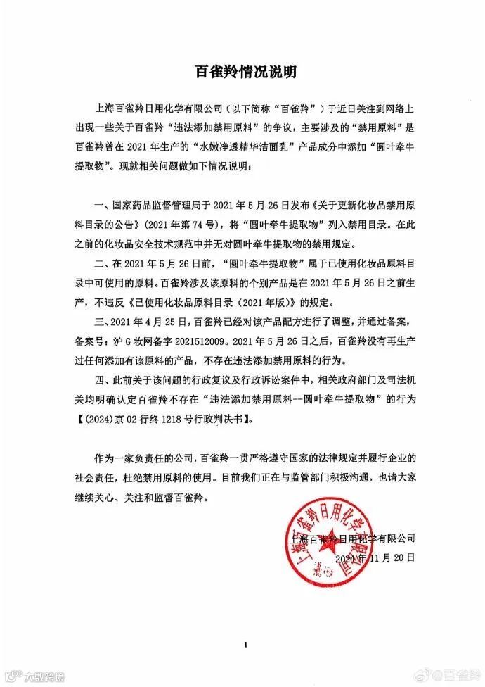 11月20日,@百雀羚 微博发布针对近日舆论关注的添加禁用原料的情况说明。