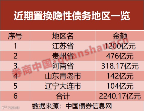 据券商中国记者不完全统计,从11月12日河南打响置换隐性债务第一枪后,先后包括辽宁大连市、贵州省、江苏省和山东青岛市披露发行或拟发行相关债券,从而置换存量的隐性债务,整体金额合计已经超过2240亿元。