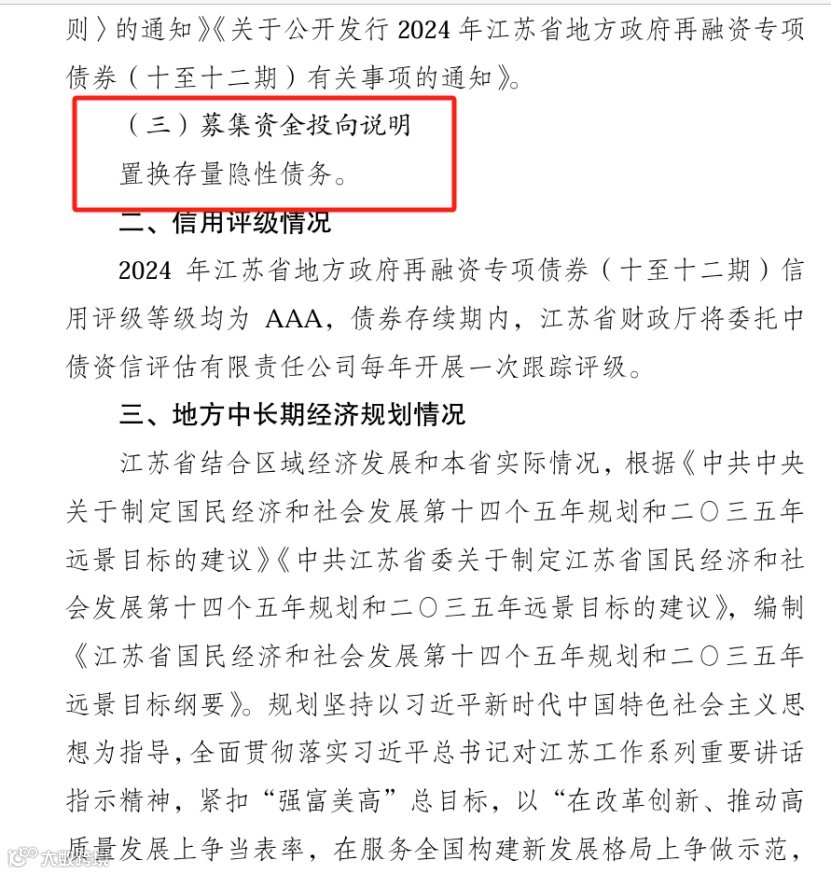 江苏省财政厅的发行文件明确,此次专项债募集资金将用于置换存量隐性债务。