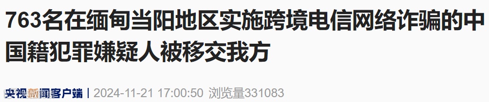 公安部对此高度重视,部署云南公安机关持续加强警务执法合作,联合缅甸相关地方执法部门开展打击行动,于11月17日在缅甸当阳地区抓获中国籍涉诈犯罪嫌疑人763名,包括网上在逃人员69名,缴获电脑、手机、诈骗话术脚本等一大批作案工具。11月19日,相关犯罪嫌疑人及涉案物品已通过云南临沧永和口岸移交我方。