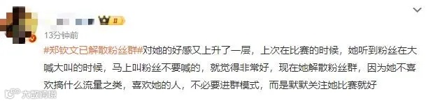 据悉,此前潘展乐也解散了自己的官方粉丝群,当时有媒体曾以“拒绝饭圈化”为主题撰文表扬了该举动。