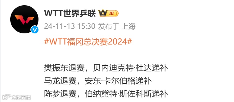 今天(11月13日)下午,世界乒联发布消息称,在即将举行的WTT福冈总决赛中,樊振东退赛,贝内迪克特·杜达递补;马龙退赛,安东·卡尔伯格递补;陈梦退赛,伯纳黛特·斯佐科斯递补。