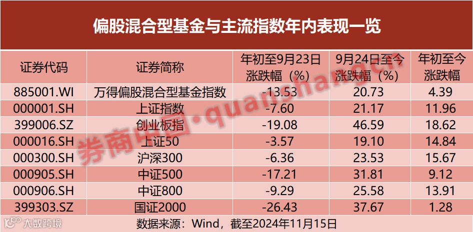 从回报率角度来看,今年以来,相较于被动投资,主动权益投资略显“逊色”。今年市场在9月底发生了较大的变化,把统计数据分为年初至9月23日,9月24日至今(截至11月15日)以及年初至今(截至11月15日)可以发现,万得偏股混合型基金指数收益率分别为-13.53%、20.73%和4.39%,而同期沪深300指数的收益率分别为-6.36%、23.53%和15.67%。从数据表现来看,偏股混合型基金在市场表现较差时回撤更大,而在市场反弹时反弹幅度更弱,全年跑输幅度较高,整体超额收益为负。
