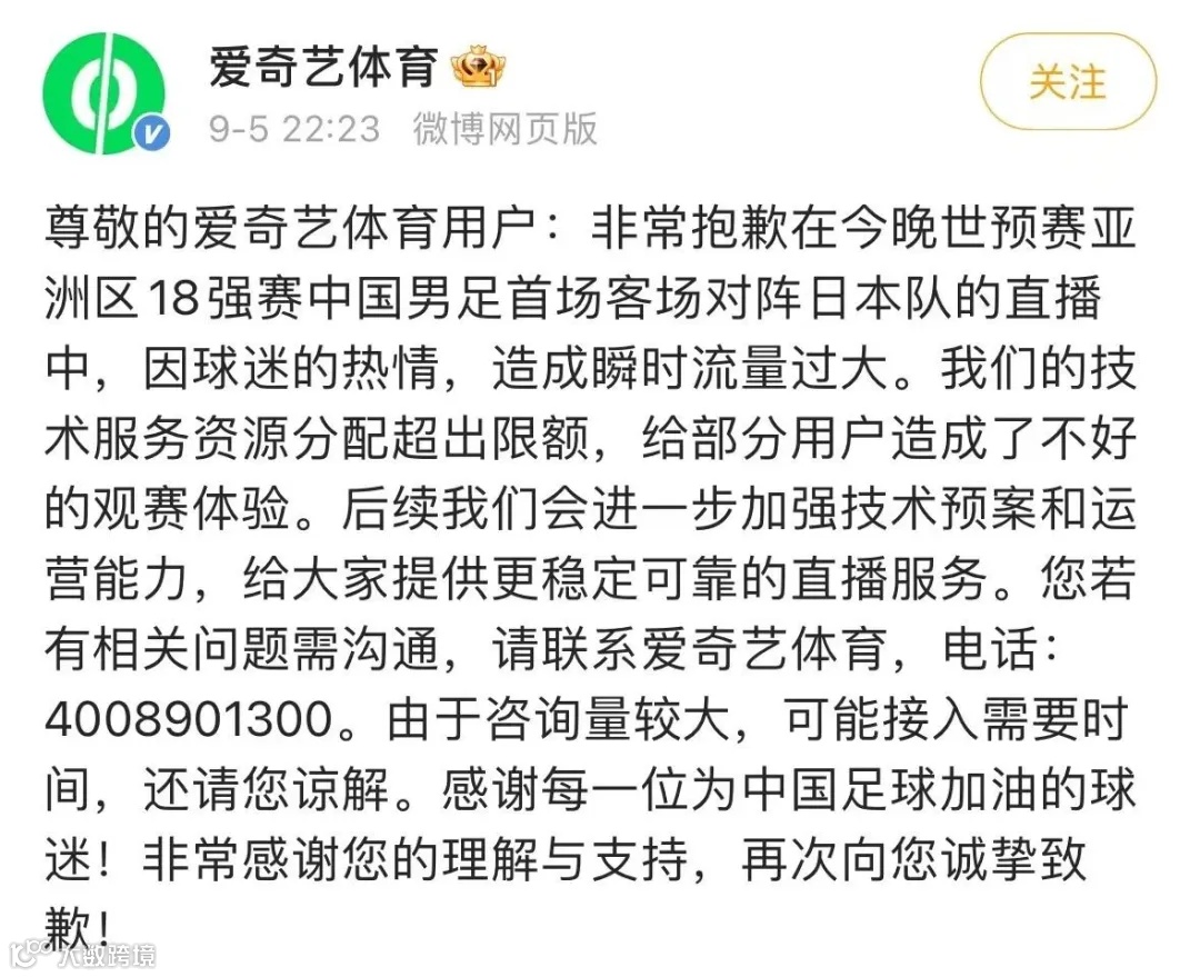 值得一提的是,在此前9月5日中国男足客场对阵日本队的比赛中,爱奇艺就曾因直播问题登上热搜。