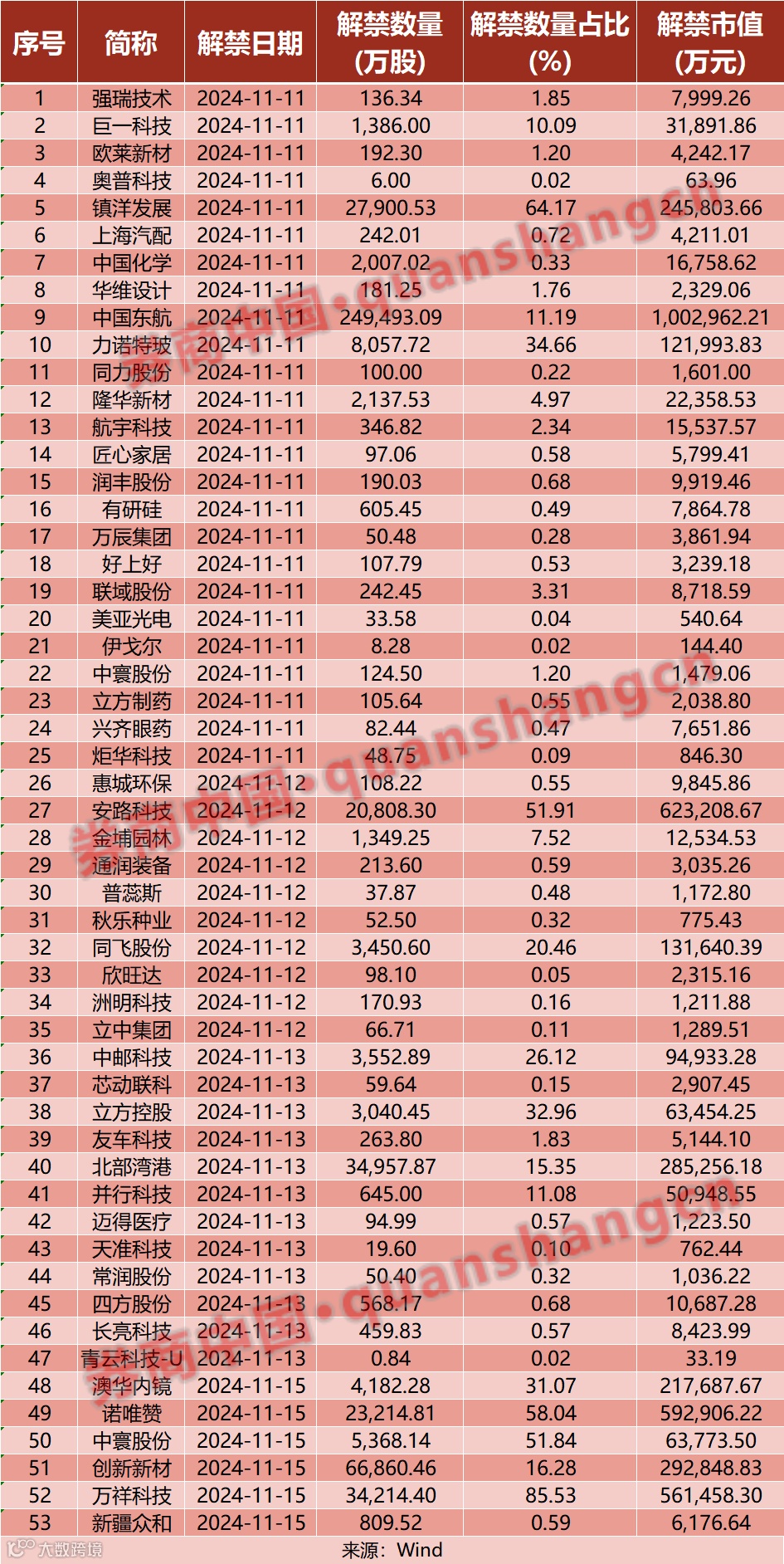 下周A股市场将有53家公司限售股陆续解禁,合计解禁数量为49.86亿股,以最新收盘价计算,合计解禁市值达到457.65亿元。解禁市值位居前三的分别是中国东航、安路科技、诺唯赞,解禁市值分别为100.30亿元、62.32亿元、59.29亿元。从解禁数量占总股本比例来看,有1只股票解禁股数量占总股本比例超过80%,为万祥科技(85.53%),有4只股票解禁股数量占总股本比例超过50%,分别是镇洋发展(64.17%)、诺唯赞(58.04%)、安路科技(51.91%)、中寰股份(51.84%)。