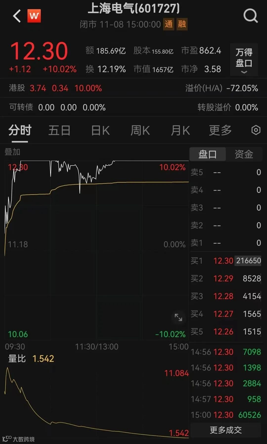 11月8日,上海电气股价再度涨停,全天成交额高达185亿元,换手率超过12%。更是在15个交易日中,拿下11个涨停板。