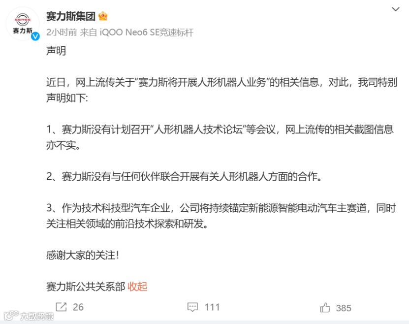 赛力斯紧急发布声明。