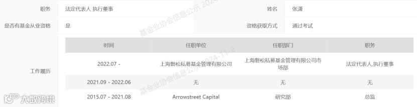 中国基金业协会信息显示,张潇在2015年7月至2021年8月间任职于阿洛斯瑞特,2021年9月至2022年6月间履历空缺,2022年7月起在磐松资产任职。