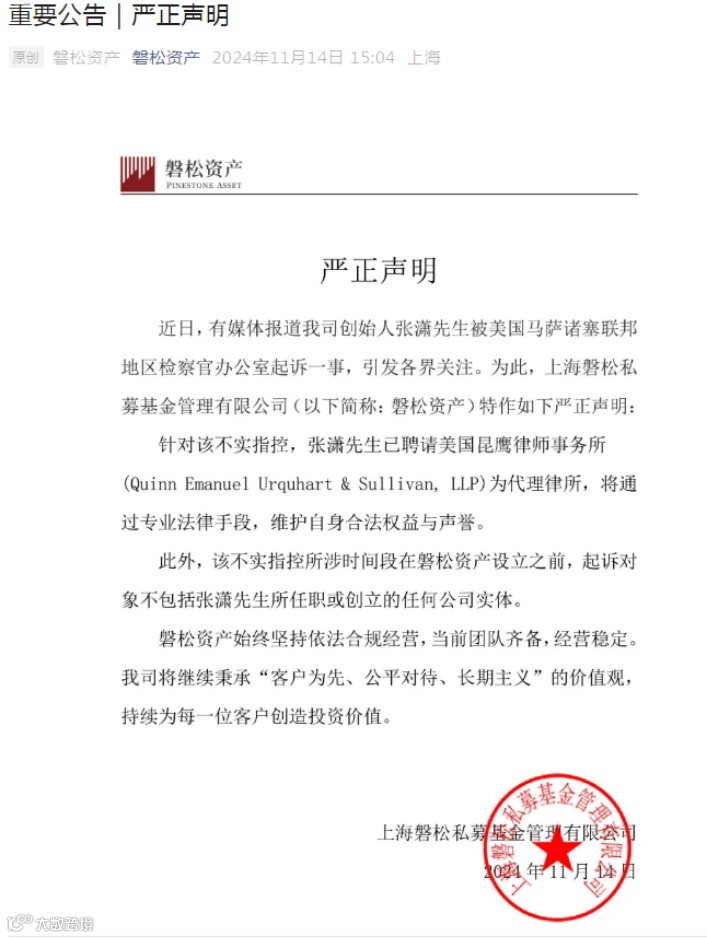 11月14日,百亿量化私募上海磐松私募基金管理有限公司(简称“磐松资产”)在官微发布公告,就公司创始人涉及海外诉讼的消息进行了回应。