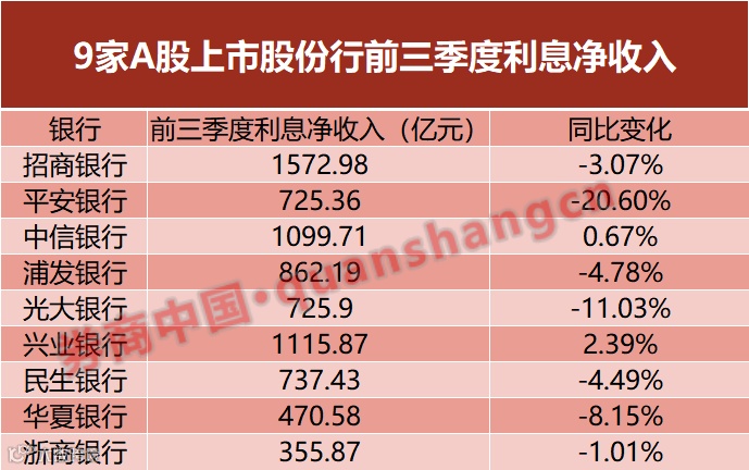 继零售营收、利润贡献度下降等特点在6月末显现后,股份行刚刚出炉的三季报又呈现新特点:作为营收支柱的利息净收入,同比下降或增速乏力。