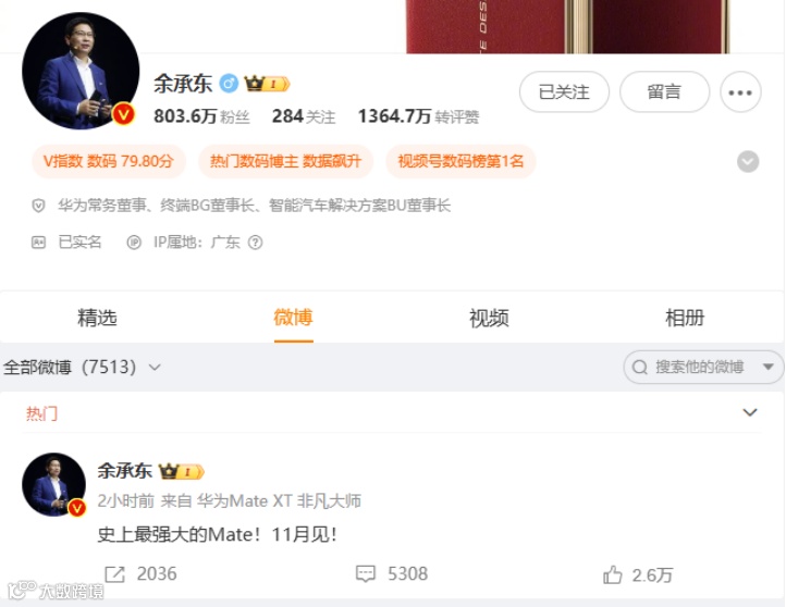 11月4日,华为常务董事、终端BG董事长余承东在个人微博上官宣华为Mate70发布时间:史上最强大的Mate!11月见!该话题冲上热搜榜。