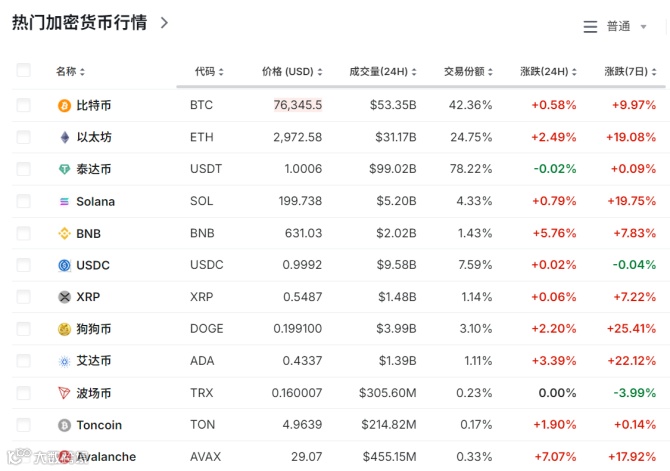 刚刚过去的24小时内,加密货币市场又大幅波动,比特币价格盘中一度突破7.7万美元,再度刷新历史新高,不过,目前已回落至7.6万美元左右;以太坊最高触及2994美元,目前回落至2972美元左右;BNB、狗狗币、艾达币等加密货币也跟随波动。截至记者发稿时,24小时内,加密货币的价格多数维持上涨。其中,比特币涨0.58%,以太坊涨超2%,BNB涨近6%,艾达币涨超3%,狗狗币涨超2%。