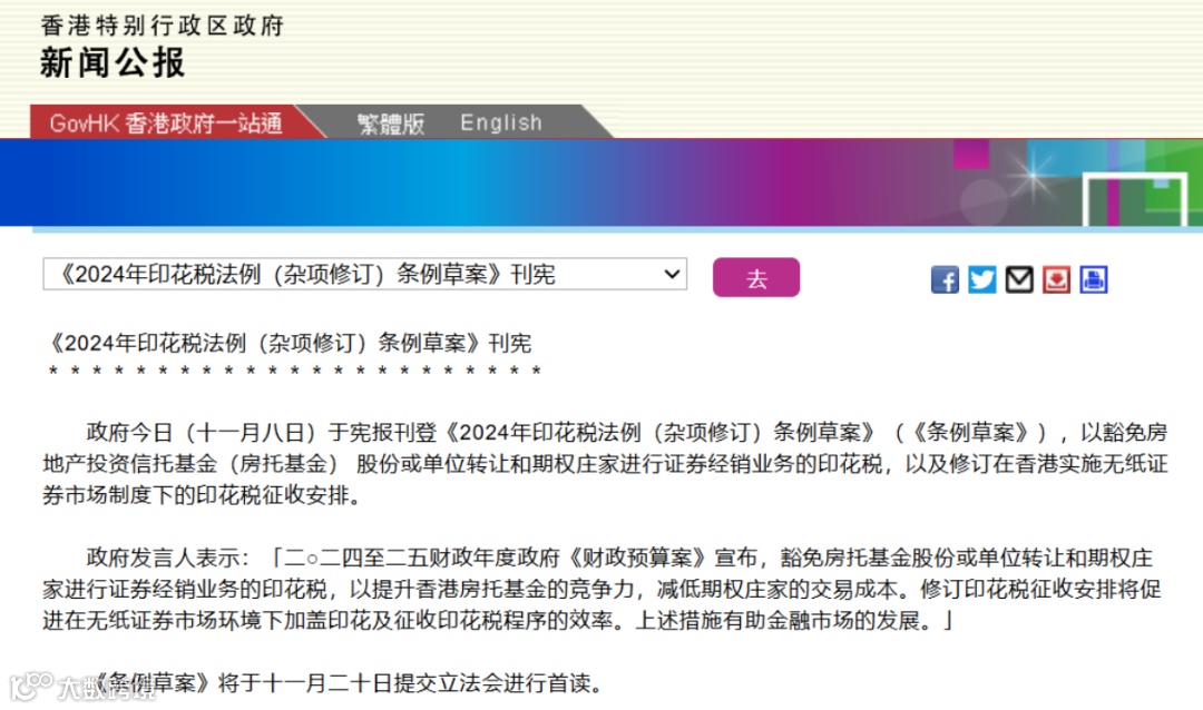 8日,香港特区政府于宪报刊登《2024年印花税法例(杂项修订)条例草案》,以豁免房地产投资信托基金股份或单位转让和期权庄家进行证券经销业务的印花税,以及修订在香港实施无纸证券市场制度下的印花税征收安排。