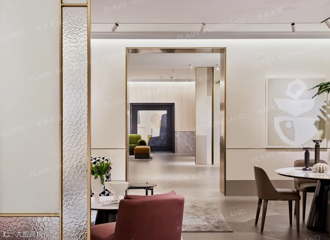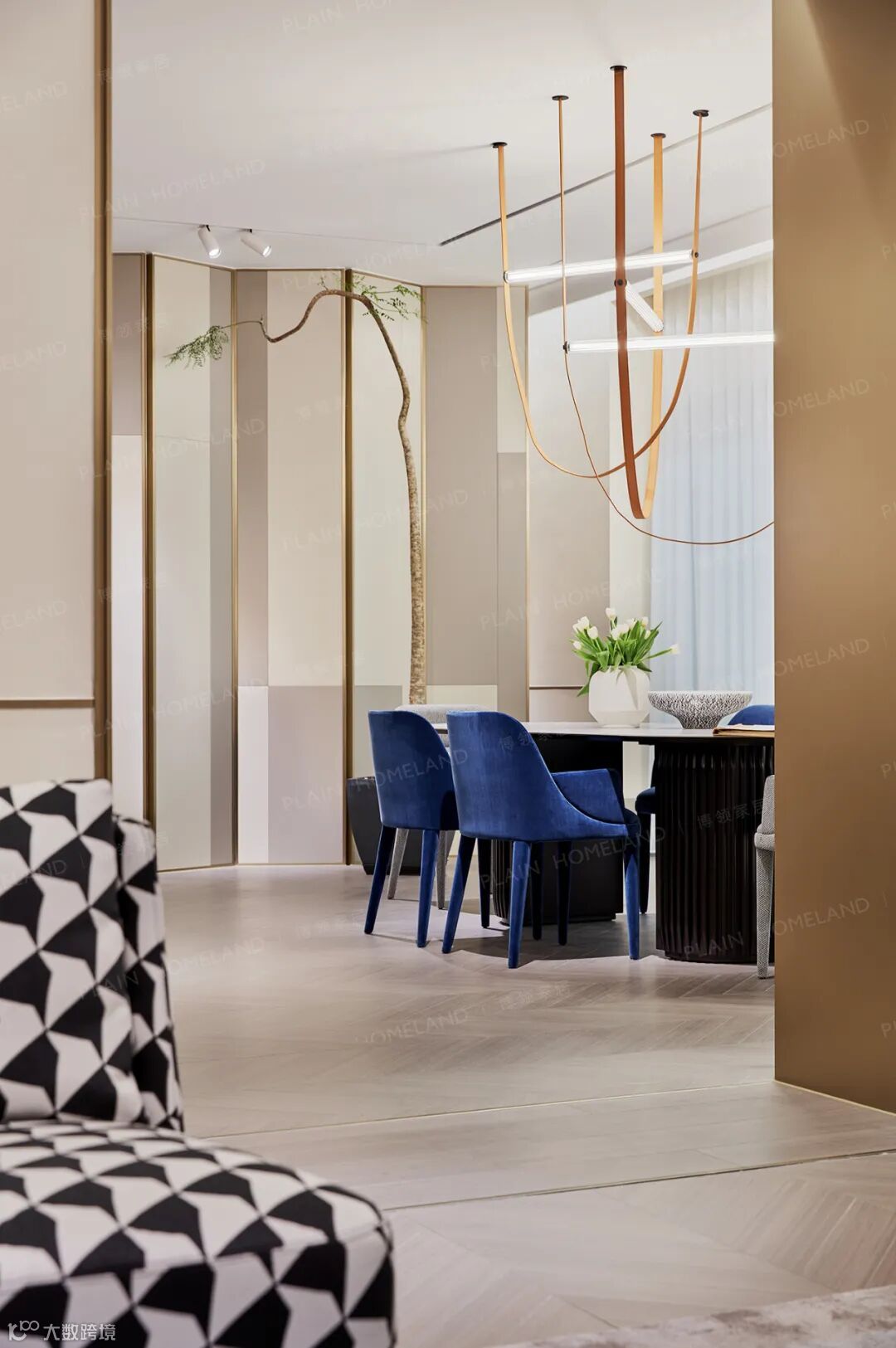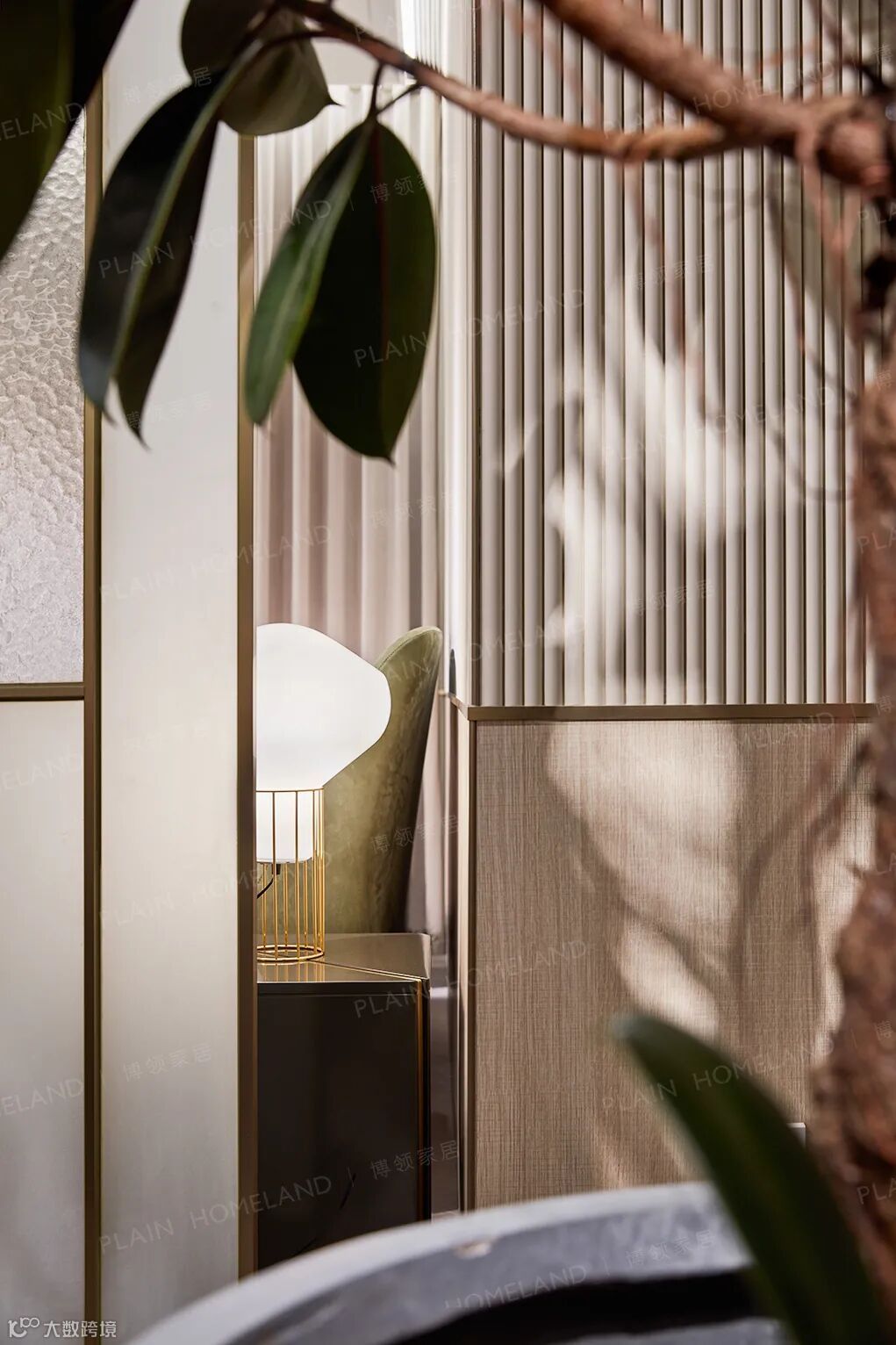 通过不同的材质组合赋予空间中的屏风几分奢华感,线面结合、虚实结合,以特定的规律排列呈现,丰富整个空间的层次感。