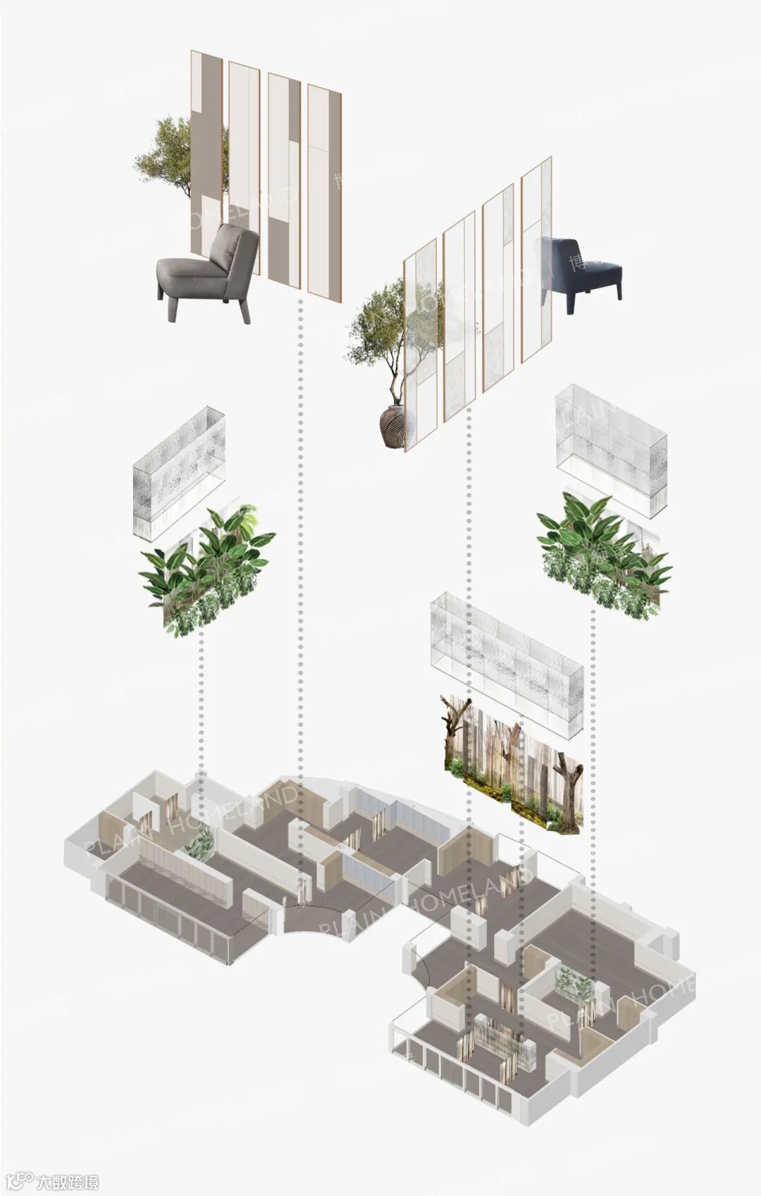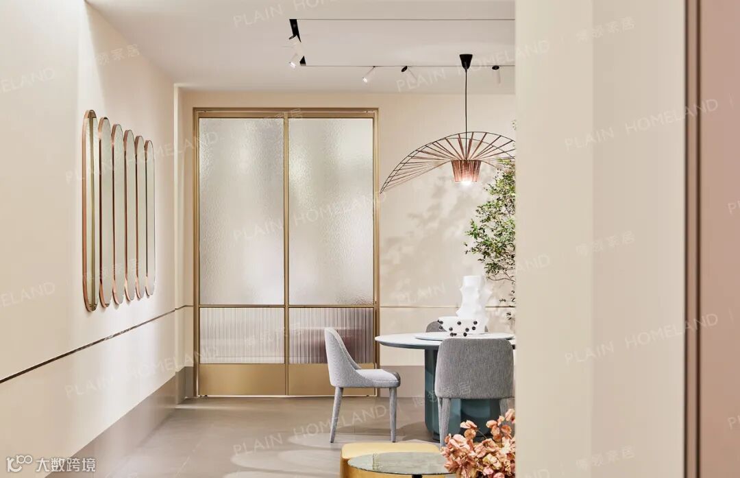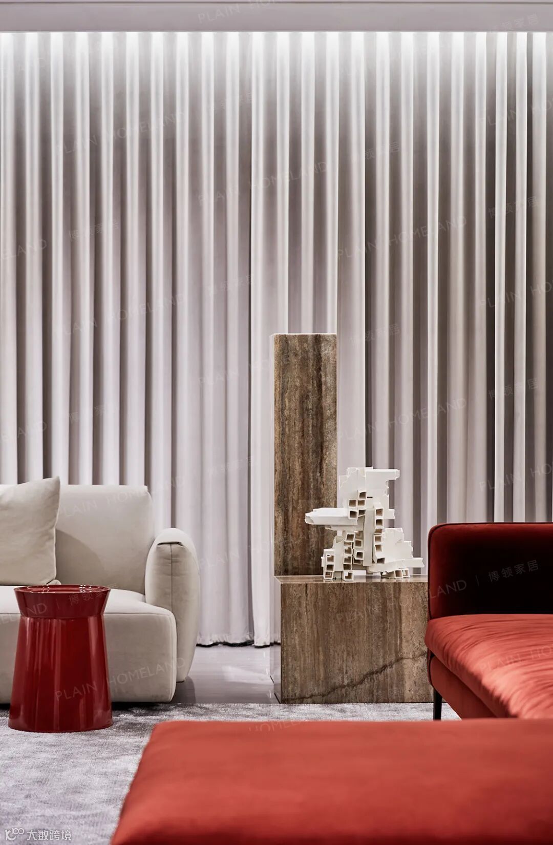 光影洒下,半透的帷幕展现着朦胧美,触发观者的好奇心,空间给予情感的延伸,产品在其中散发出独有的个性,人、空间、产品在自然中融为一体。展厅不再止于产品售卖的单一场所,是知性、从容生活方式的呈现,是与消费者之间的情感链接。