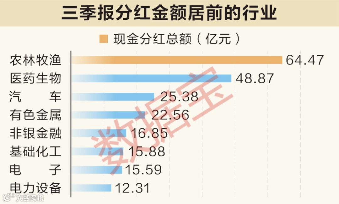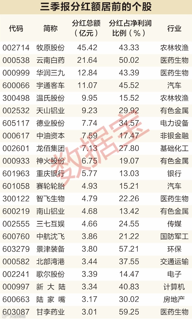 从单家公司来看,48家上市公司三季报现金分红总额在1亿元以上,牧原股份、云南白药、华润三九、宇通客车分红总额居前,均超过10亿元。