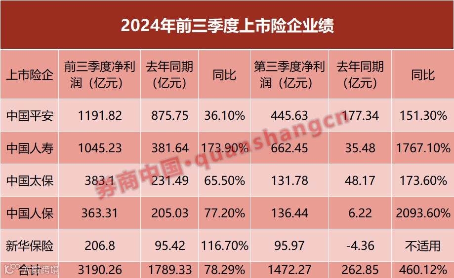 据券商中国记者统计,中国平安、中国人寿、中国太保、中国人保、新华保险前三季度合计净利润(均为归母净利润口径,下同)达到3190亿元,同比大增78%。