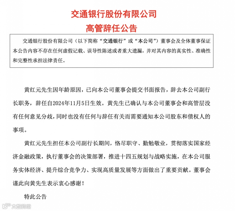 11月5日,交通银行发布公告称,黄红元因年龄原因,已向公司董事会提交书面报告,辞去该行副行长职务,辞任自2024年11月5日生效。