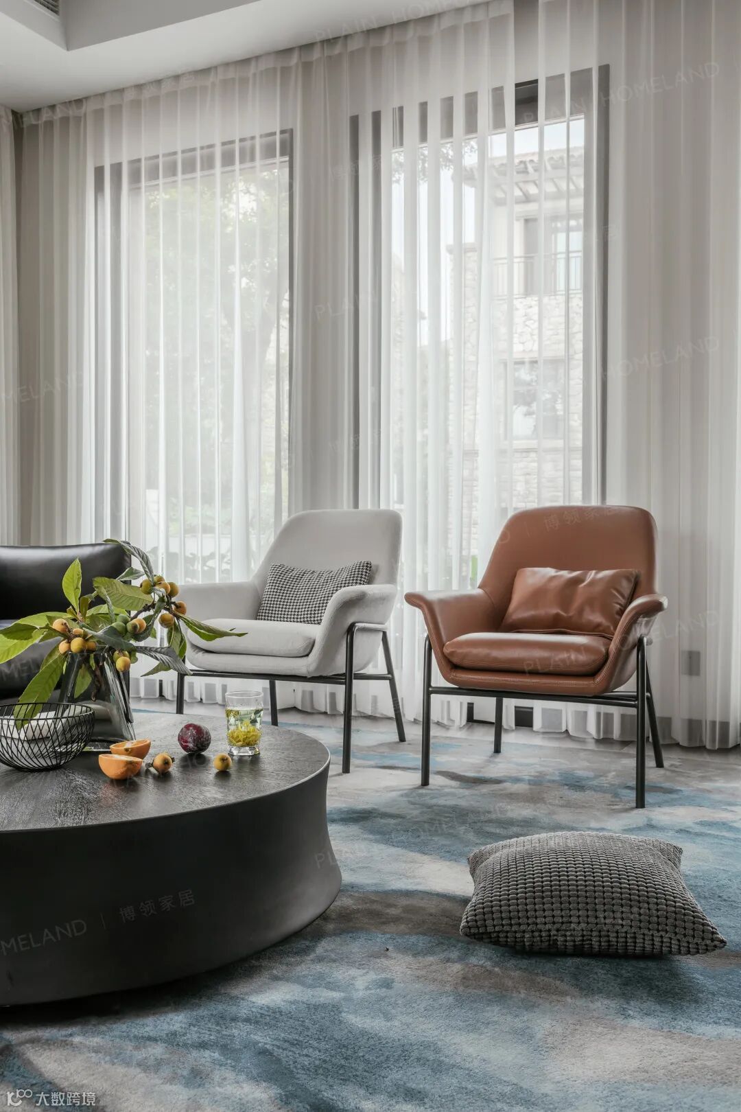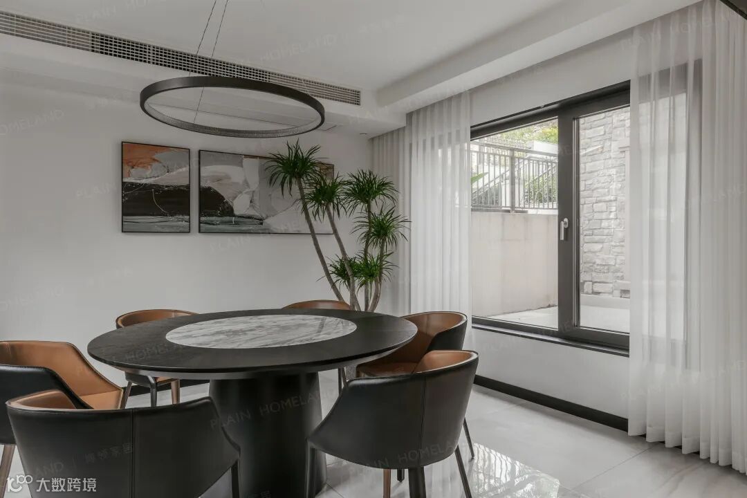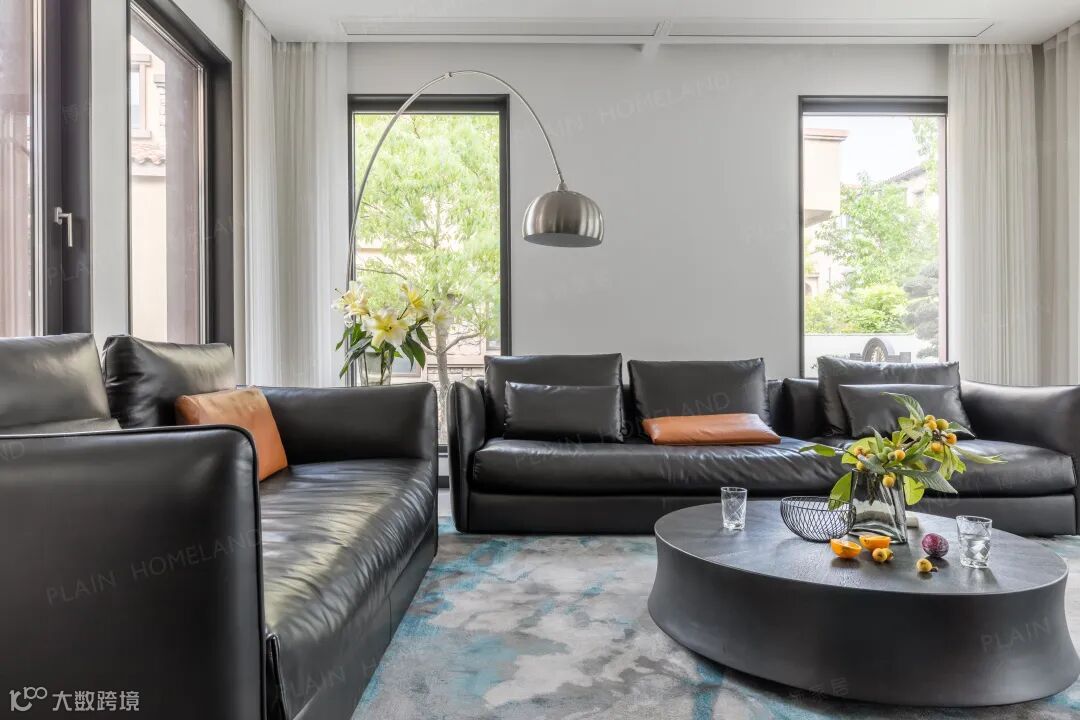 客厅空间以大量落地窗成就光影自由,荫阳参半,使其在柔和色调中叠加以自然有机的触感,让空间整体变得更加柔和温馨。黑色真皮沙发与点缀棕相撞,大块面与小细节的层次变化,散发低调现代的气质。