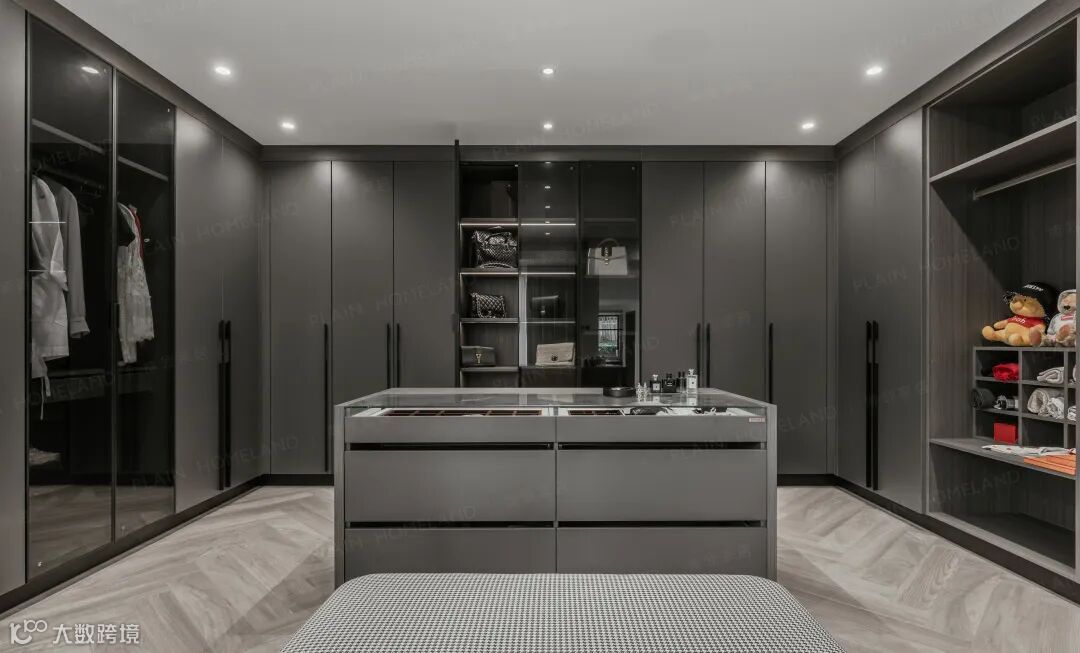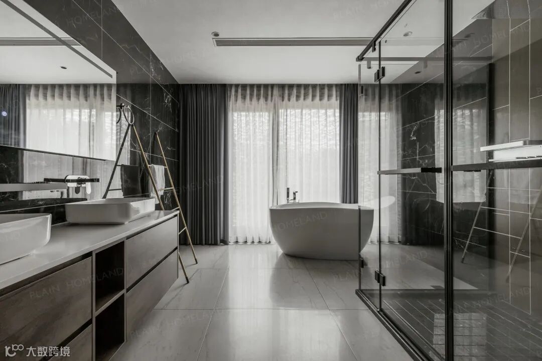 衣帽间深灰打底,浮岛台并未造成视觉拥挤,审美与实用性并不冲突,自然而适恰;卫浴则以浅灰与黑色相衬相搭,简洁干净,不以造型取胜,更注重精神与格调。