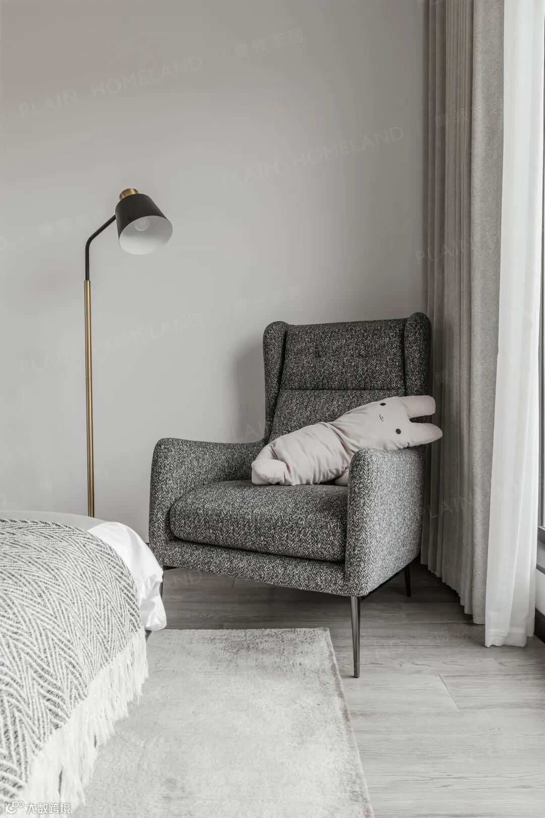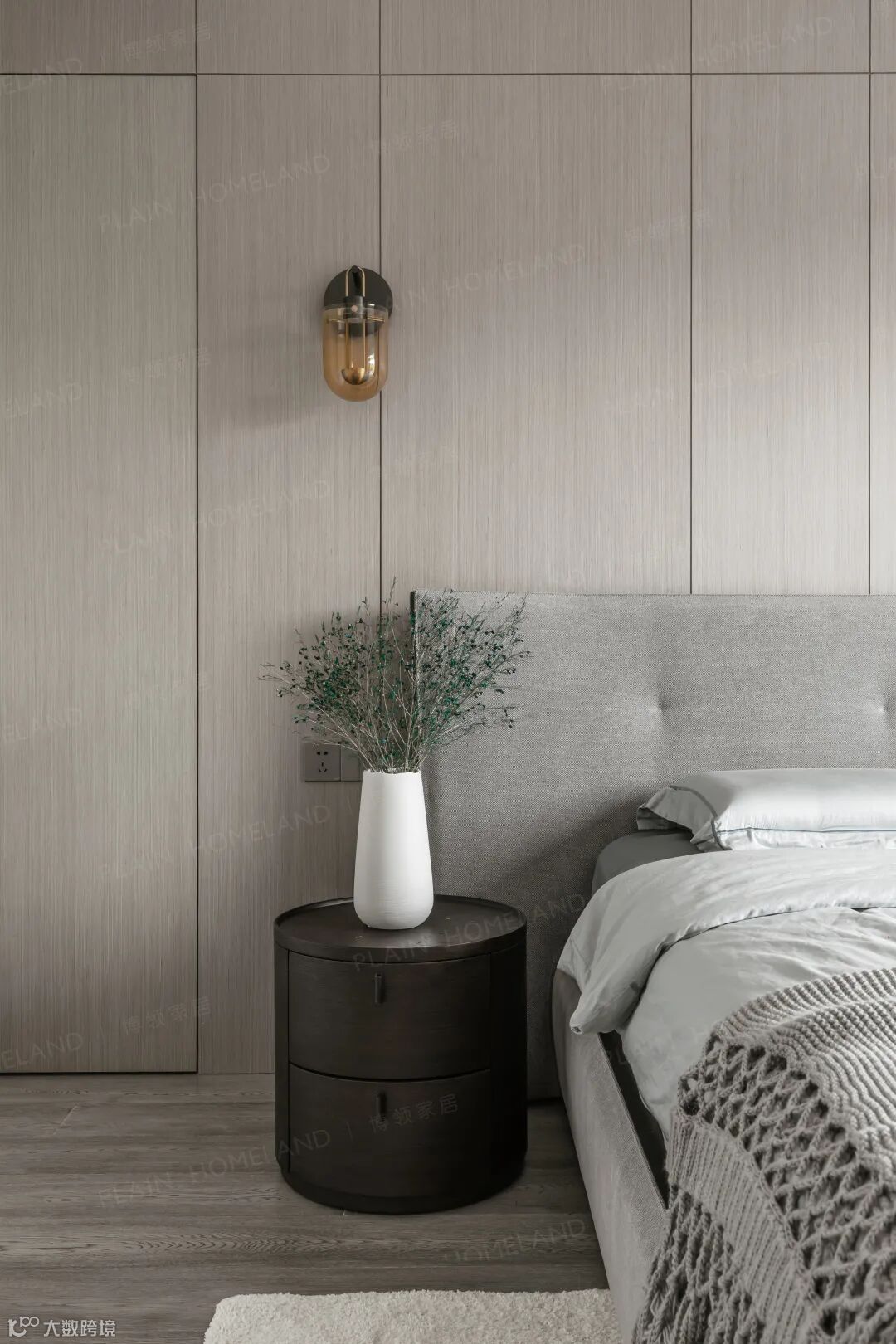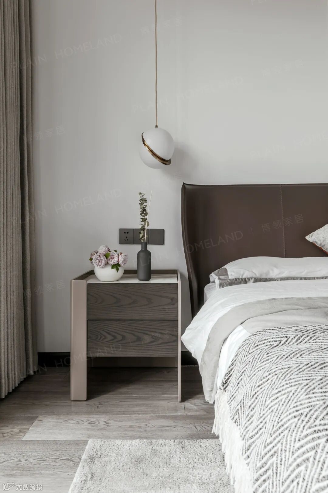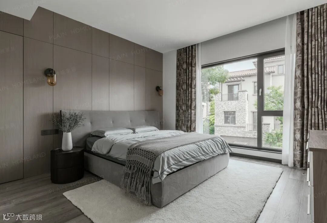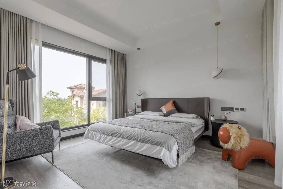 回到私密性更强的起居区域,舒适与温馨是第一要义,浅灰与深棕让氛围转向沉静,一面是自然的光景,一面是大床的舒惬,慵慵自若亦生生不息。