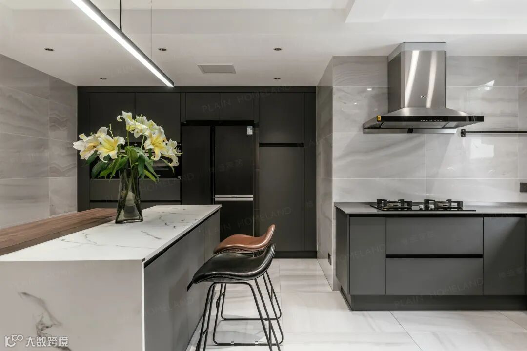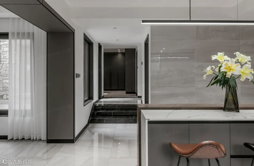 入宅即见的高挑玄关将自然光线接入,使环境与建筑的天然优势最大化,山水泼墨般的主色调,仿佛穿越千年中国文化底蕴而来,为其增加典雅属性,黑白相映,软硬相宜,尽展大宅风度。