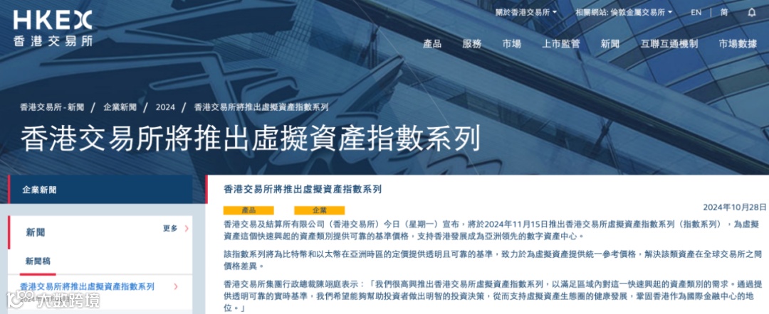 今日,香港交易所宣布,将于2024年11月15日推出香港交易所虚拟资产指数系列(指数系列),为虚拟资产这个快速兴起的资产类别提供可靠的基准价格,支持香港发展成为亚洲领先的数字资产中心。
