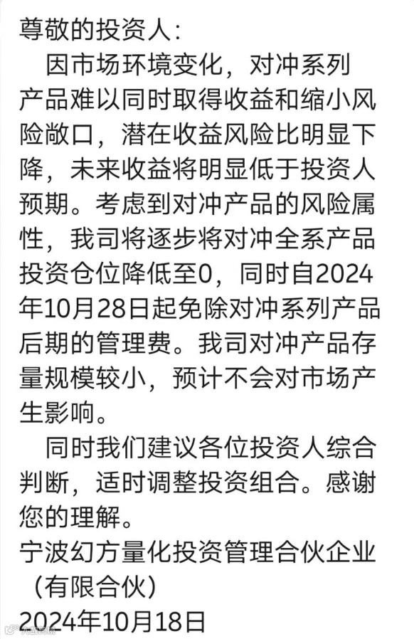 幻方量化在给投资人发送的消息中称,因市场环境变化,对冲系列产品难以同时取得收益和缩小风险敞口,潜在收益风险比明显下降,未来收益将明显低于投资人预期。考虑到对冲产品的风险属性,公司逐步将对冲全系产品投资仓位降低至0,同时自2024年10月28日起免除对冲系列产品后期的管理费。