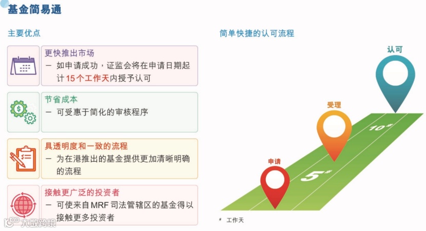 香港证监会称,其目标是在接获申请人完整而具质素的资料后,于15个工作日内授予认可。新机制将涵盖来自香港证监会订有基金互认安排的司法管辖区(MRF司法管辖区)的简单基金。