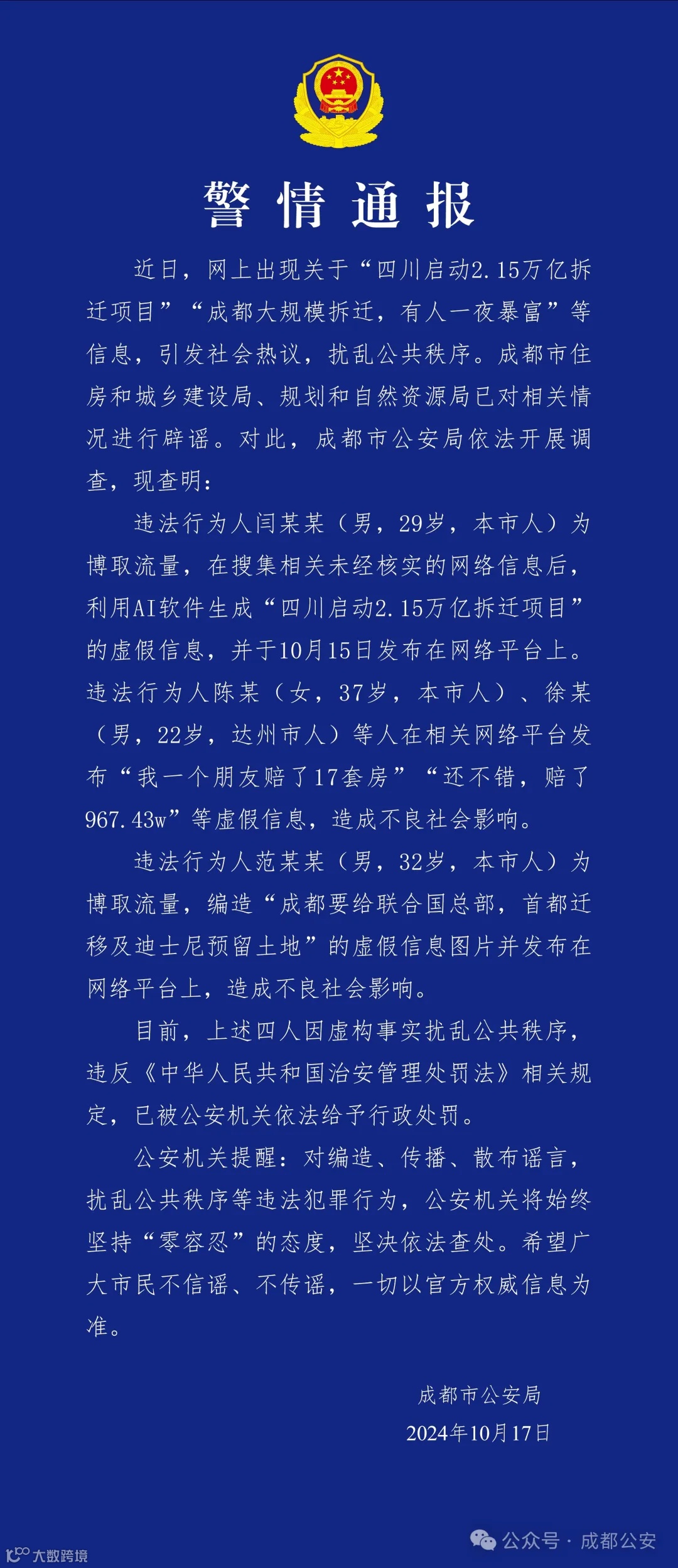那么,谣言是如何产生的?成都市公安局披露,29岁的成都男子闫某某为了博取流量,在搜集相关未经核实的网络信息后,利用AI软件生成“四川启动2.15万亿拆迁项目”的虚假信息,并于10月15日发布到网上。