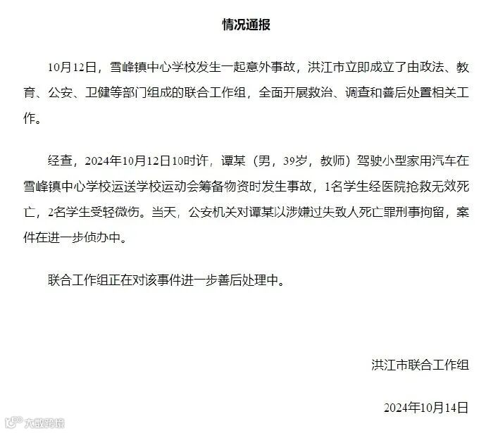 10月12日,雪峰镇中心学校发生一起意外事故,洪江市立即成立了由政法、教育、公安、卫健等部门组成的联合工作组,全面开展救治、调查和善后处置相关工作。经查,2024年10月12日10时许,谭某(男,39岁,教师)驾驶小型家用汽车在雪峰镇中心学校运送学校运动会筹备物资时发生事故,1名学生经医院抢救无效死亡,2名学生受轻微伤。