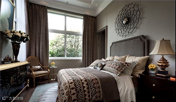老人房则强调稳重舒适,设计师将拜占庭太阳元素带入空间,同时穿插些许中式意向,演绎出中西交融的视觉美学。