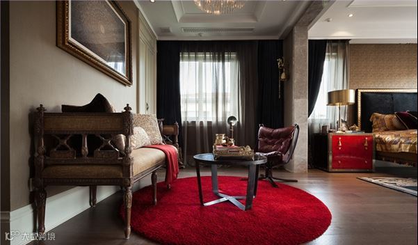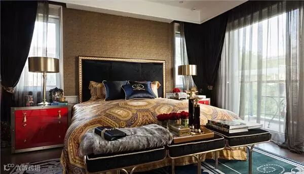 主卧以黑红为主色,搭配金色,营造主卧的不可复制性。以教堂穹顶的图案为艺术创作的挂画,体现拜占庭时期的精神符号。