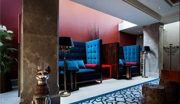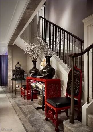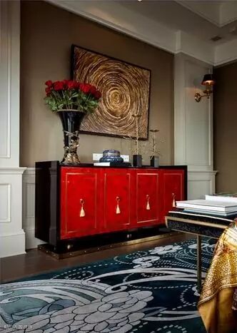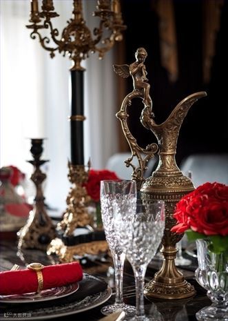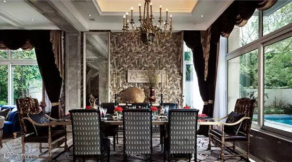 尊贵丰饶的金、冷静睿智的黑、热情灵动的红和正义神圣的蓝延续拜占庭艺术色彩美学。家具样式的设计,将拜占庭时期的教堂拱窗,铜灯和繁杂蜿蜒的建筑线条等元素运用其中,成为翡翠别墅的语言。陈设方面,设计无视东方或西方、古典或现代的边界,让空间中涌动着拜占庭对差异热烈开放的接纳,对未来的期待和对力量的敬畏。