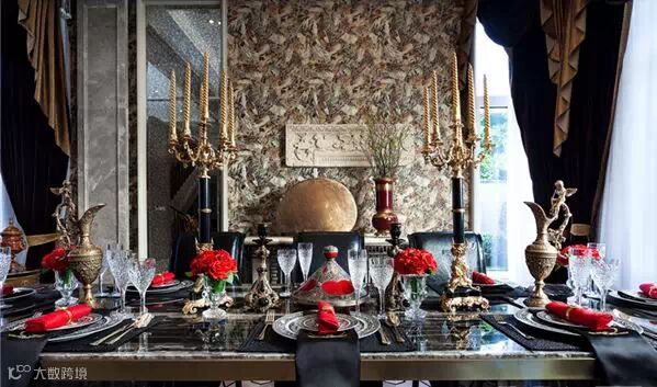 餐厅以宴请为前提,营造就餐仪式 ,餐桌采用黑色大理石,搭配来自意大利古董豹纹主餐椅,金色VERSACE1999纪念版餐具,构建拜占庭宴会阵列,强调用餐的秩序和礼仪。
