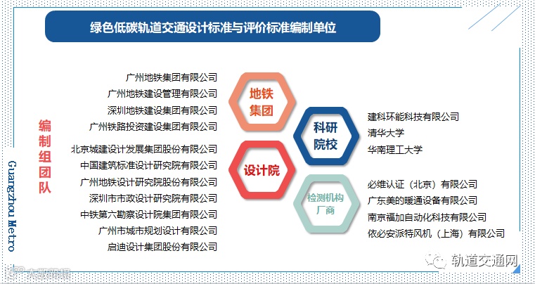两个标准由广州地铁集团、深圳地铁建设集团等建设单位联合中国建研院环能科技、清华大学、华南理工大学等科研院校,联合北京城建设计发展集团、中国建筑标准设计研究院、广州地铁设计研究院、深圳市市政设计研究院,中铁六院等设计单位以及必维集团、广东美的、南京福加等检测机构、厂商,实现了“地铁集团 + 国家绿建体系构建单位 +知名院校+ 轨道交通设计咨询第一梯队+国际知名绿建咨询及供货服务单位”的强强联合,为标准的高质量发布打下坚实的基础。