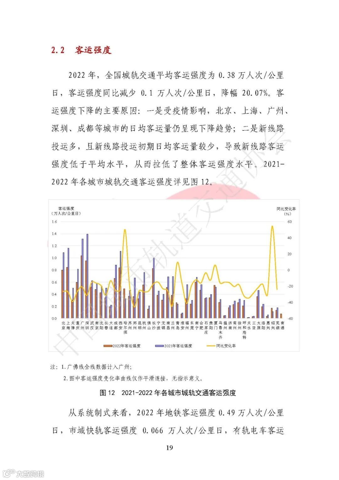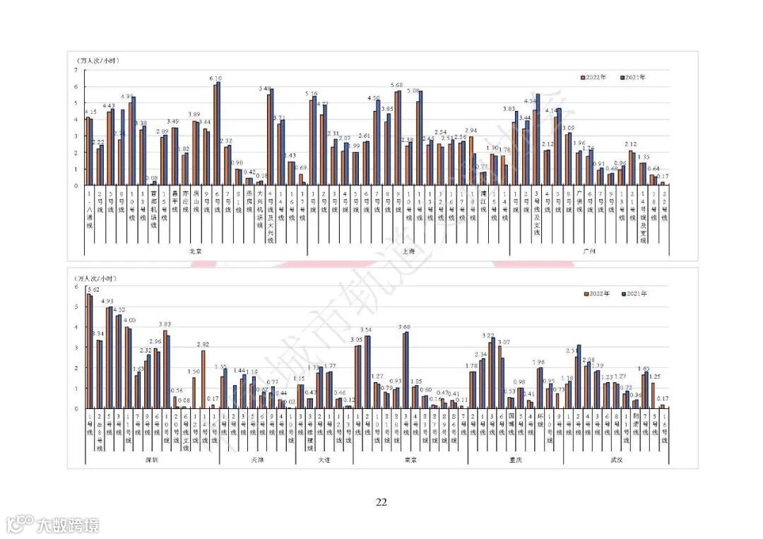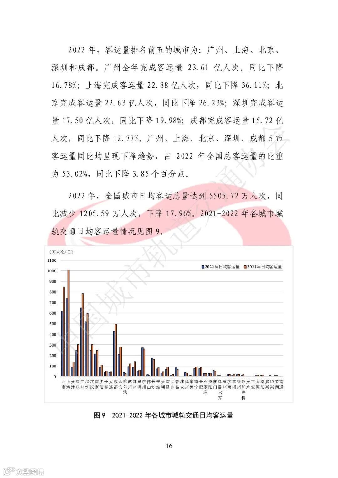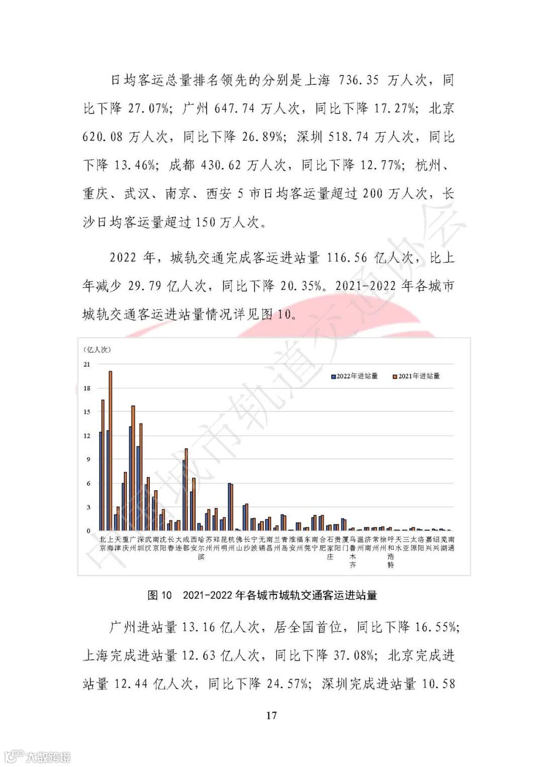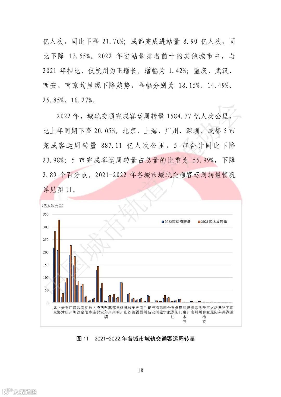 拥有4条及以上运营线路,且换乘站3座及以上的城市26个,占已开通城轨交通运营城市总数的47.27%。2022年全年累计完成客运量193.02亿人次,同比下降18.54%;总进站量为116.56亿人次,同比下降20.35%;总客运周转量为1584.37亿人次公里,同比下降20.05%;与上年同期相比全年客运水平整体下降。