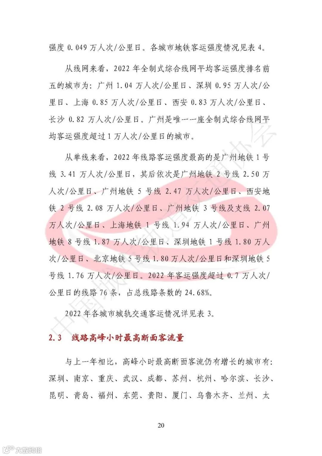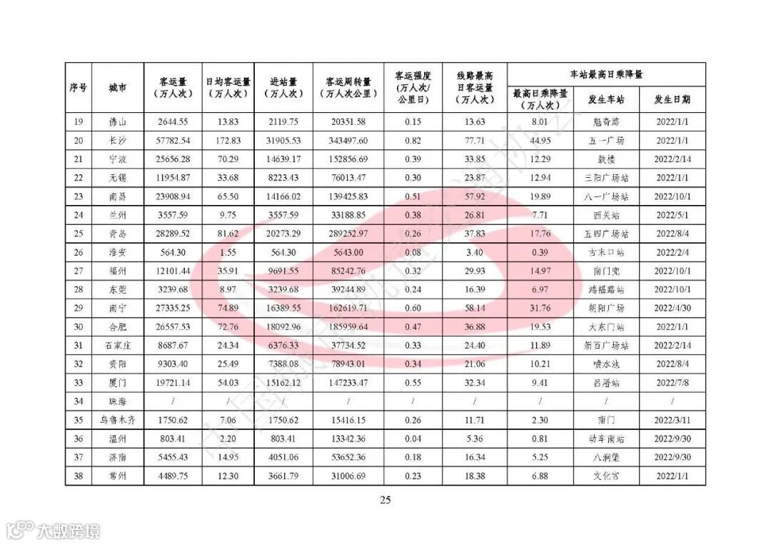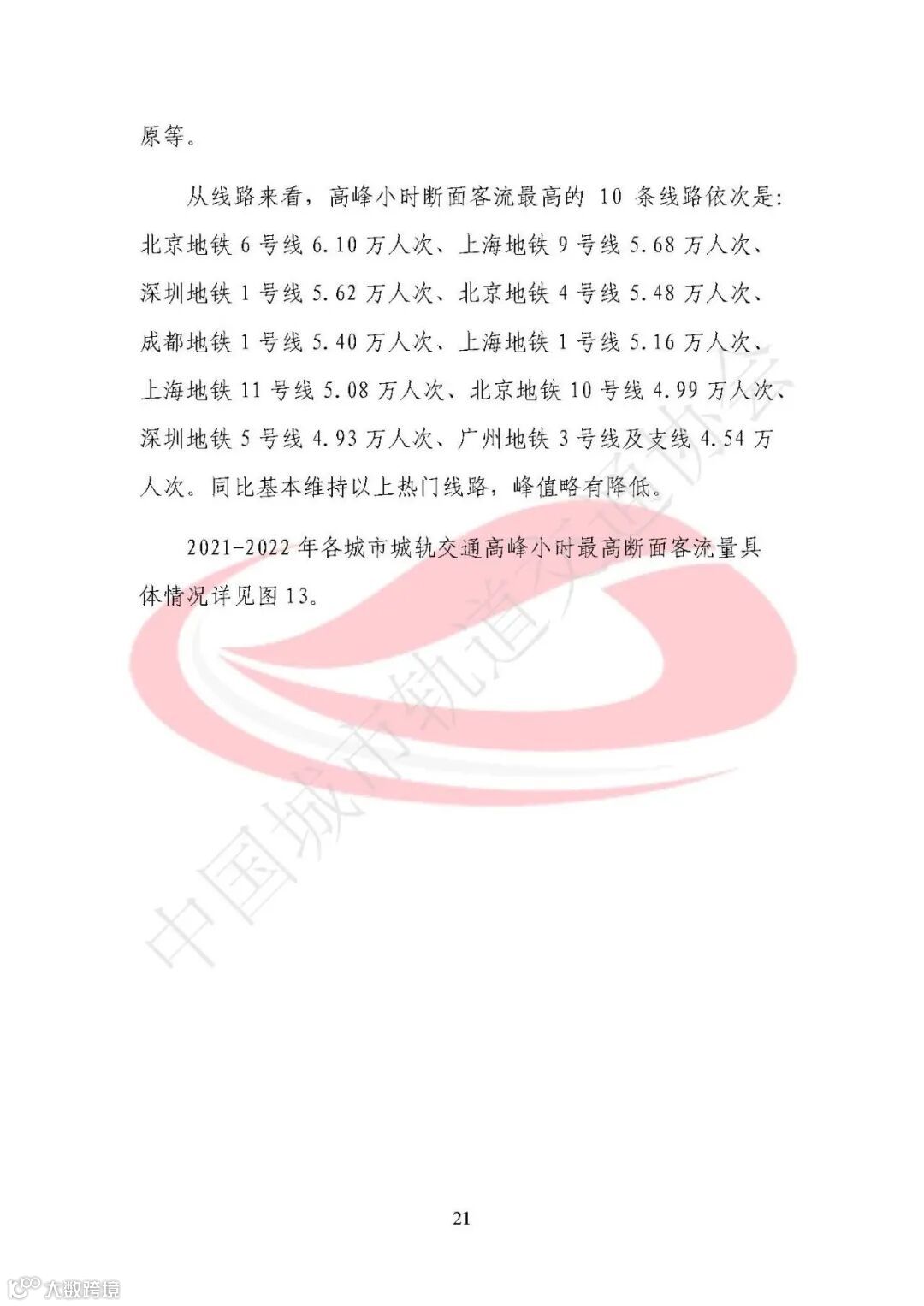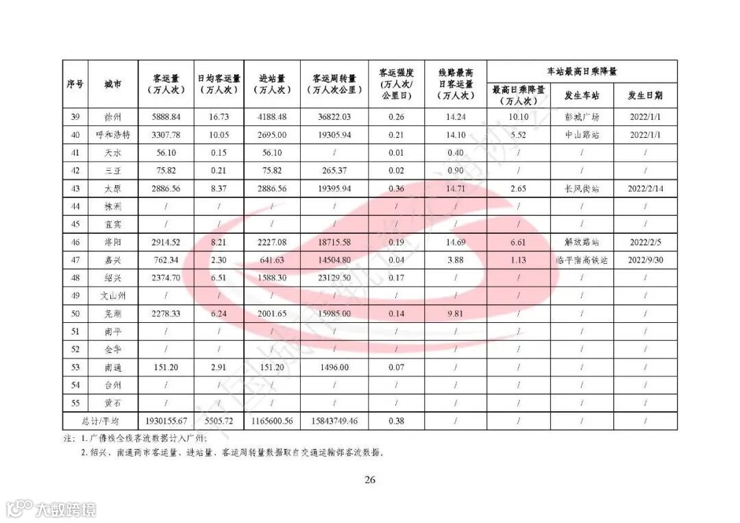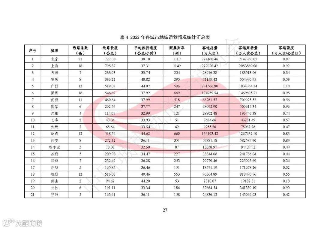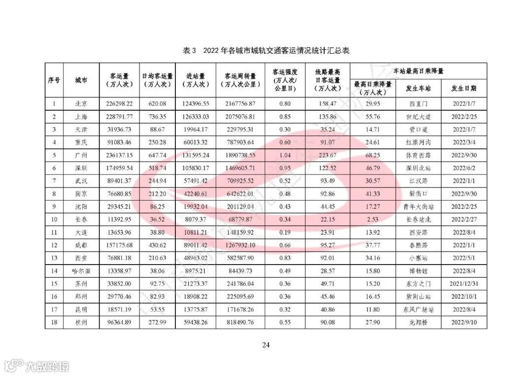 拥有4条及以上运营线路,且换乘站3座及以上的城市26个,占已开通城轨交通运营城市总数的47.27%。2022年全年累计完成客运量193.02亿人次,同比下降18.54%;总进站量为116.56亿人次,同比下降20.35%;总客运周转量为1584.37亿人次公里,同比下降20.05%;与上年同期相比全年客运水平整体下降。