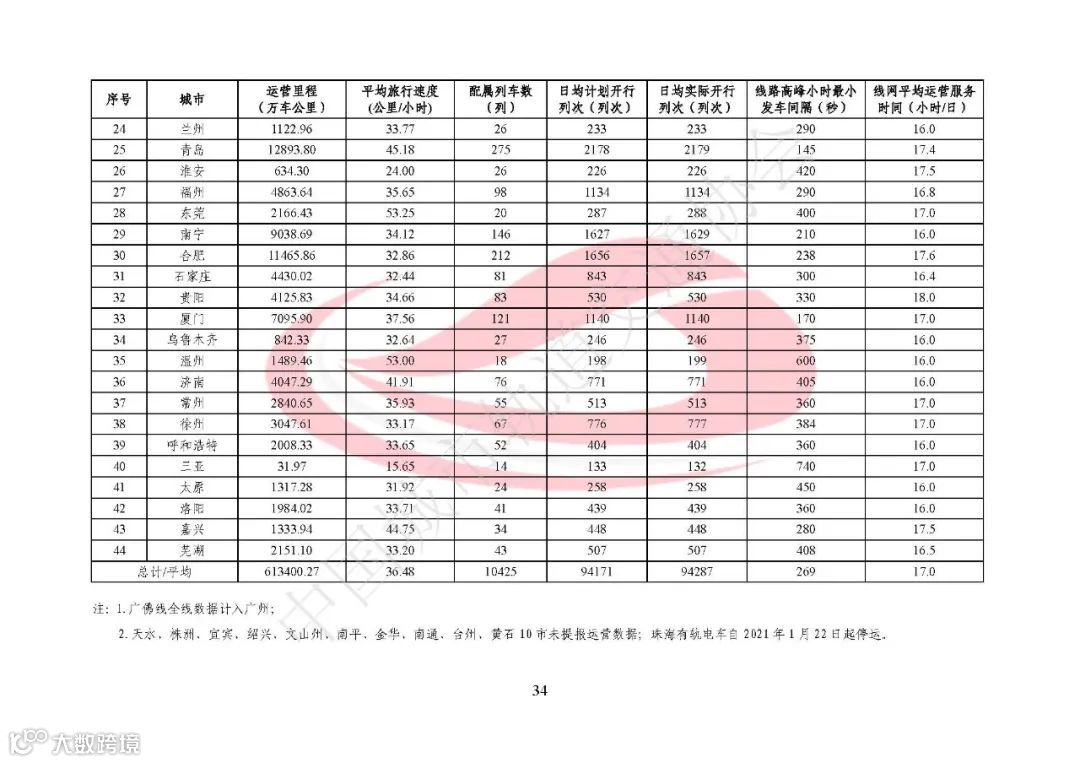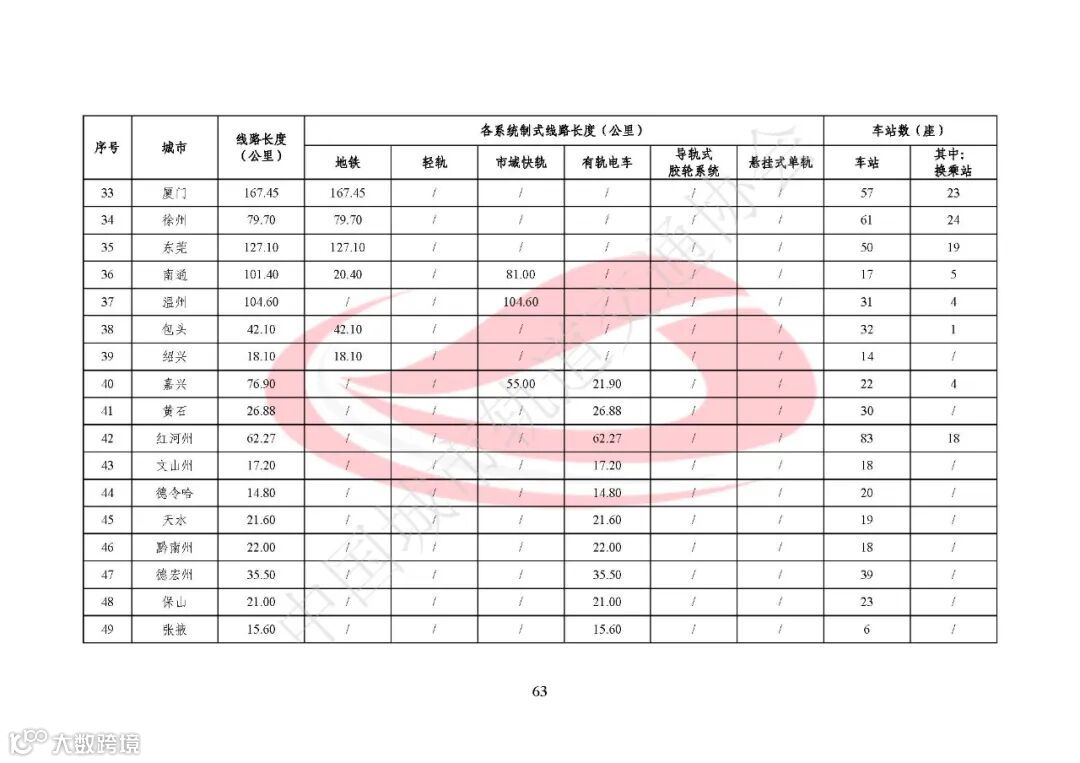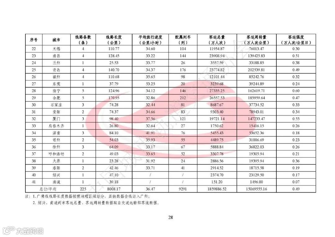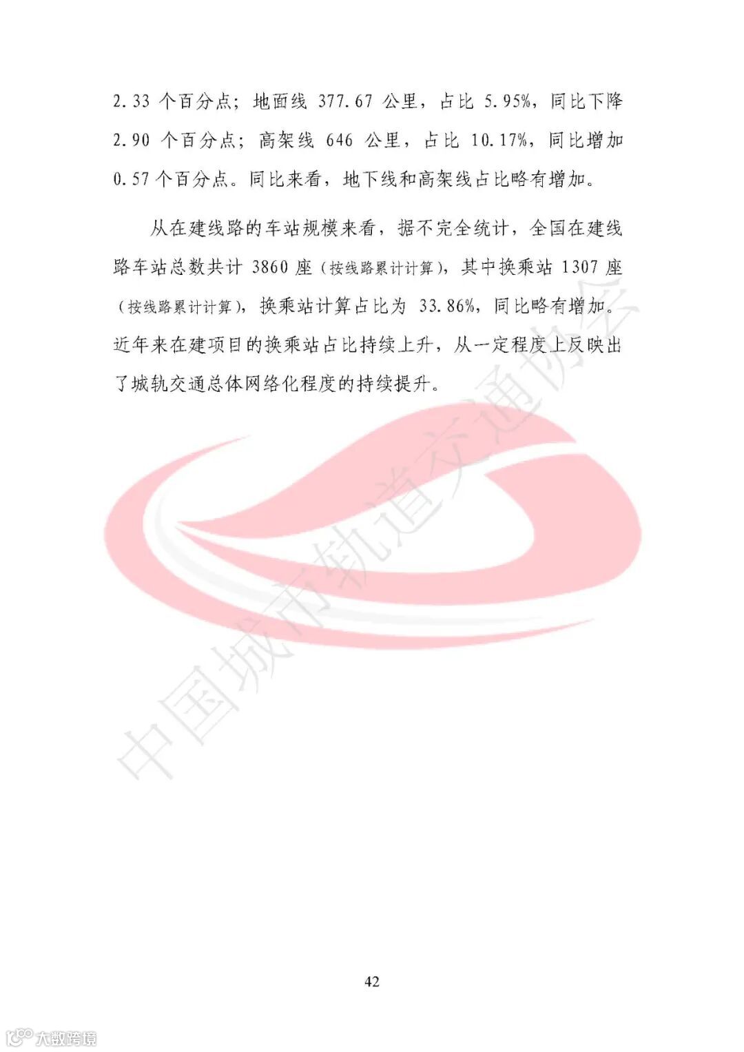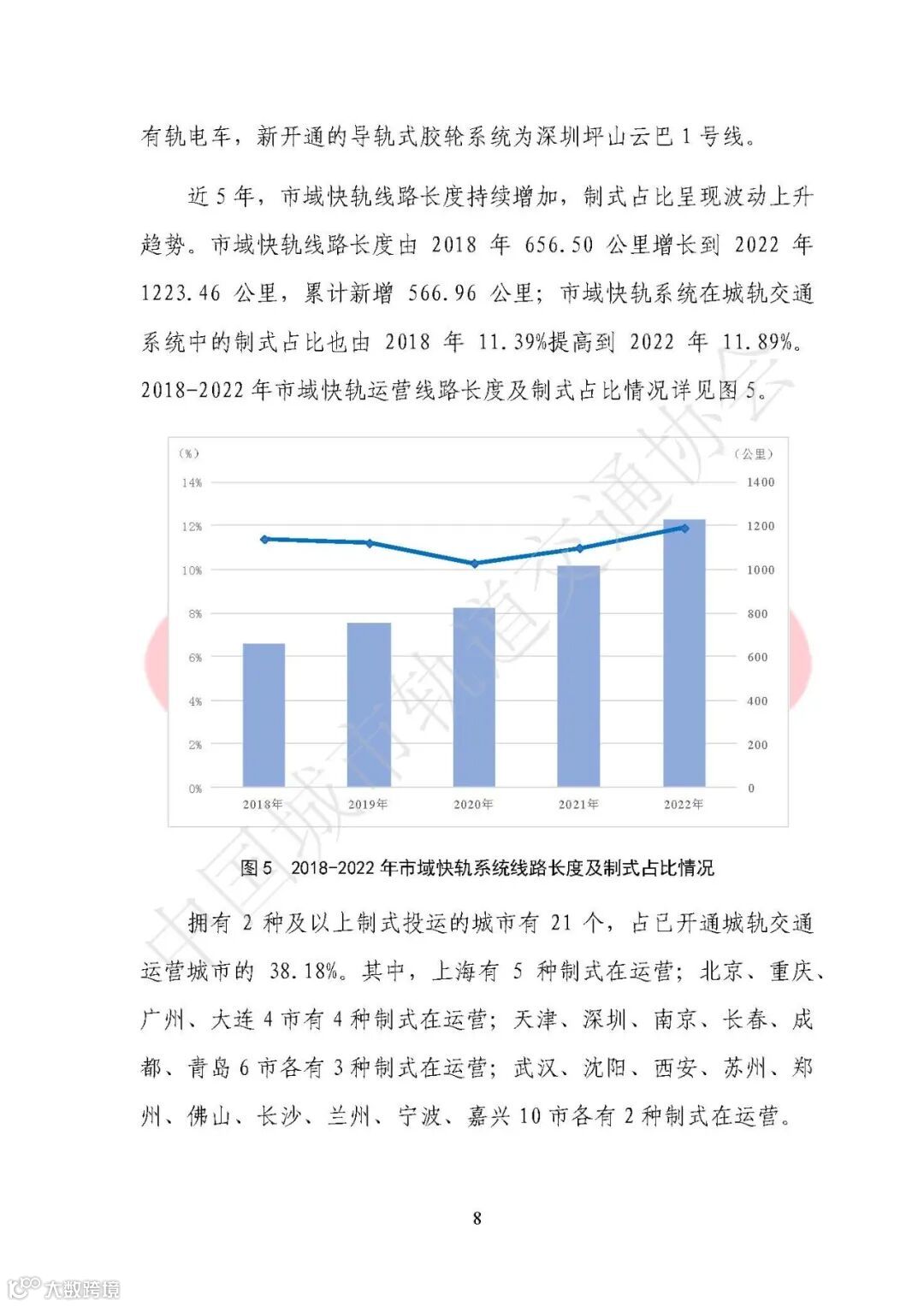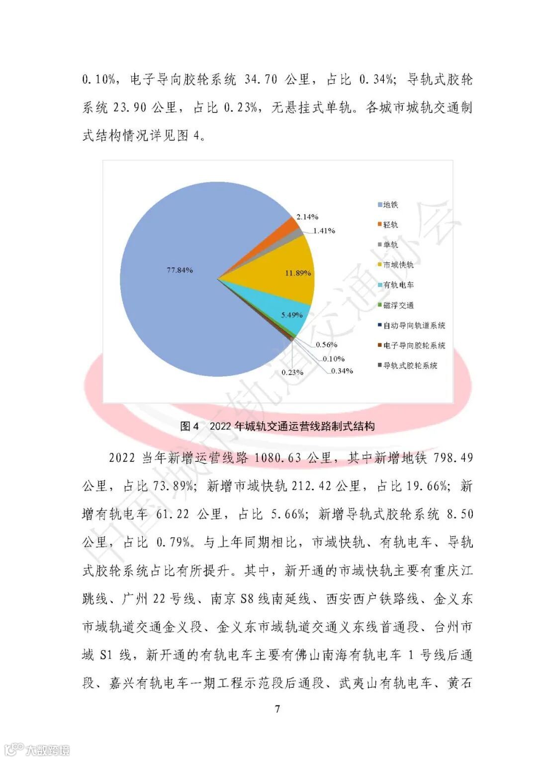 其中,地铁运营线路8008.17公里,占比77.84%;其他制式城轨交通运营线路2279.28公里,占比22.16%。当年新增运营线路长度1080.63公里。