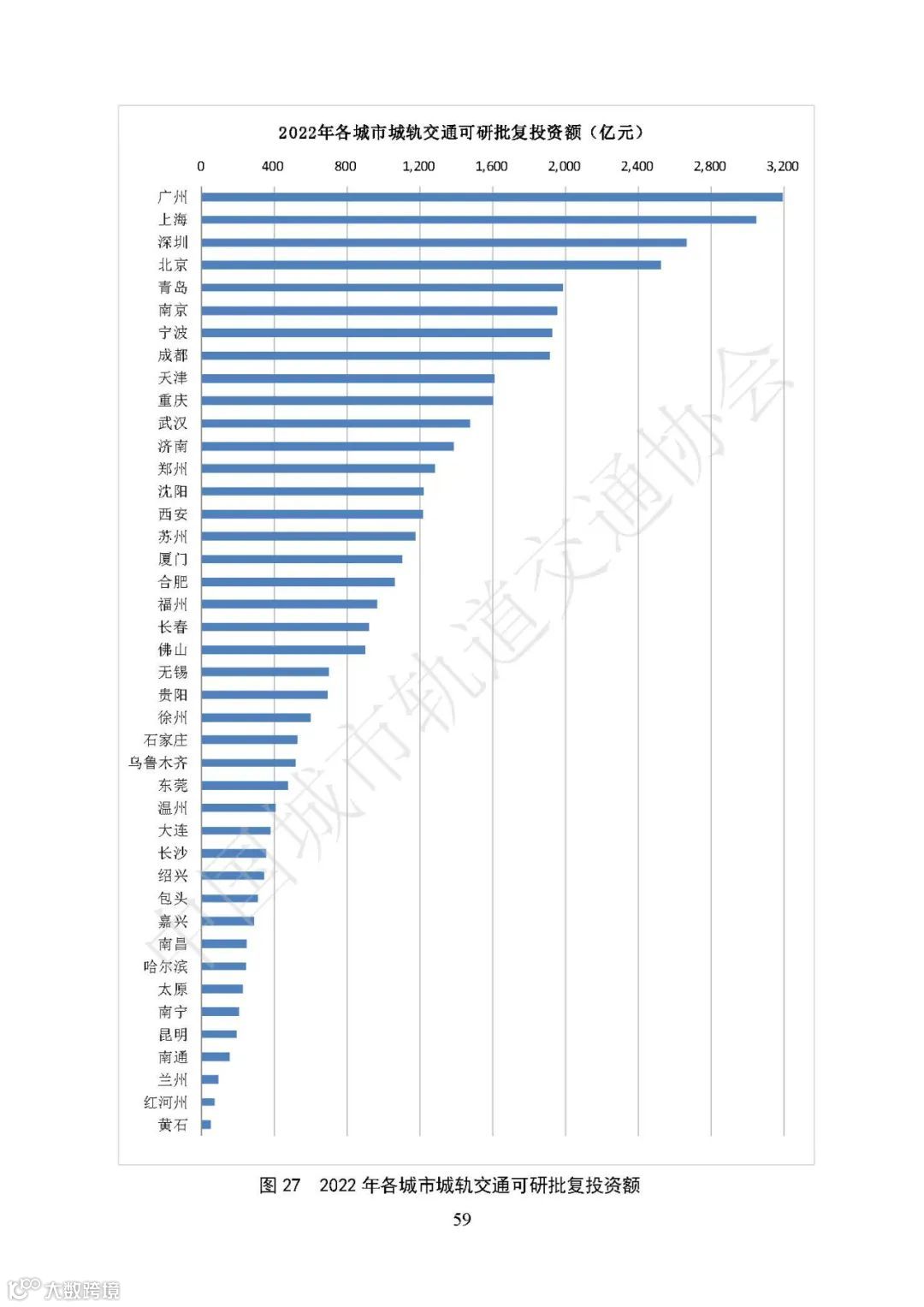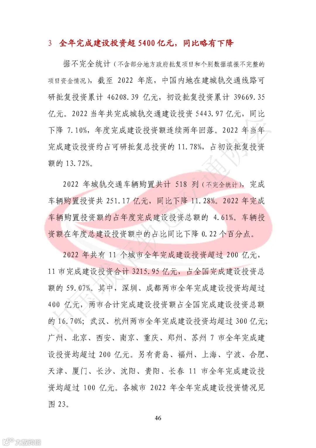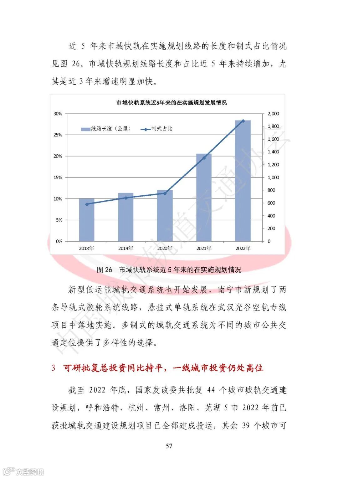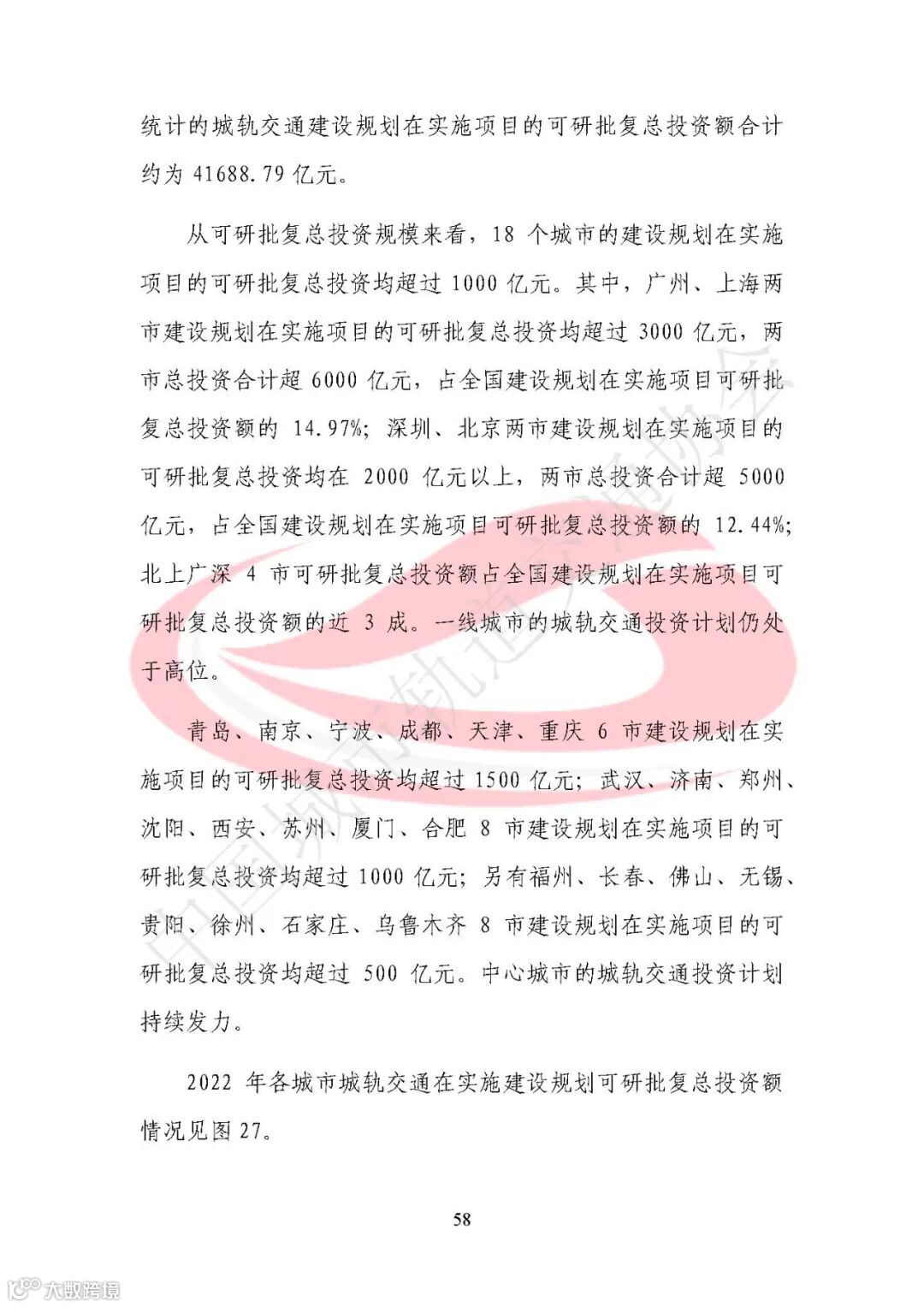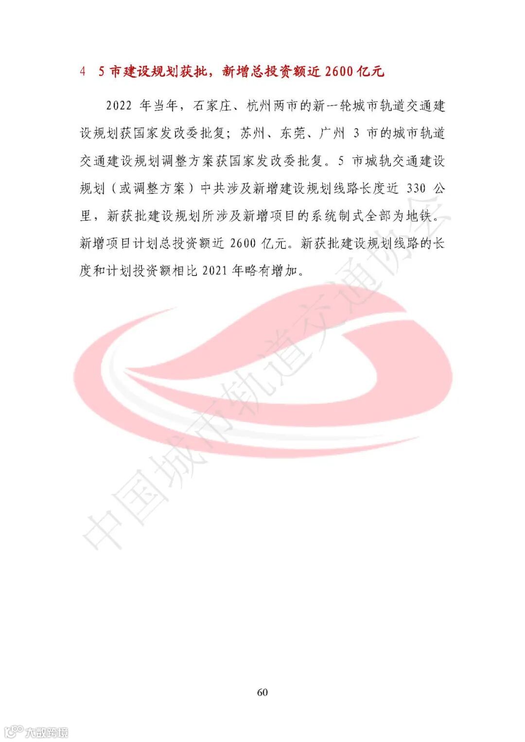 在实施的建设规划线路总长6675.57公里(不含统计期末已开通运营线路);可统计的在实施建设规划项目可研批复总投资额合计为41688.79亿元。2022年当年,共有两个城市新一轮城轨交通建设规划和3个城市的城市轨道交通建设规划调整方案获国家发改委批复,获批项目中涉及新增线路长度约330公里,新增计划投资额约2600亿元。