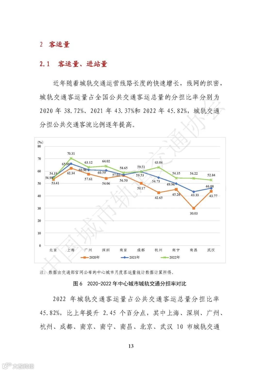 2022年城轨交通客运量占公共交通客运总量的分担比率为45.82%,比上年提升2.45个百分点,其中