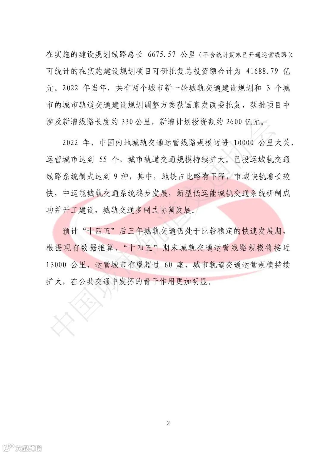 2022年,中国内地城轨交通运营线路规模迈进10000公里大关,运营城市达到55个,城市轨道交通规模持续扩大。已投