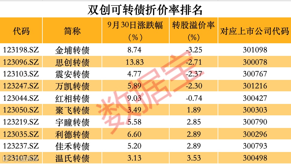 转股溢价率较低的双创股票可转债,节后有望迎来补涨。数据显示,有5只创业板个股可转债转股溢价率为负,金埔转债转股折价率最高,超过3%。