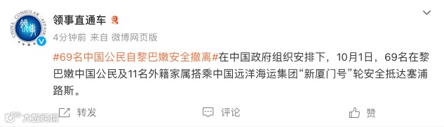 在中国政府组织安排下,10月1日,69名在黎巴嫩中国公民及11名外籍家属搭乘中国远洋海运集团“新厦门号”轮安全抵达塞浦路斯。